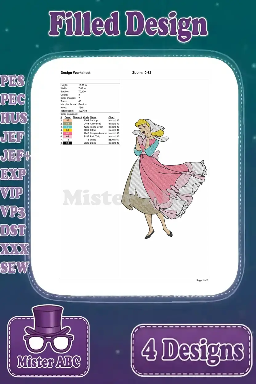 Cinderella Pink Dress Dancing Portraits Blue Ballgown Rags Scrubbing – Filled Embroidery Design