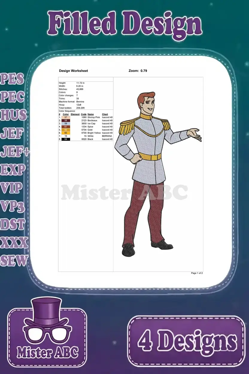 Cinderella Prince Charming Collection Of Standing Poses Different Views – Filled Embroidery Design