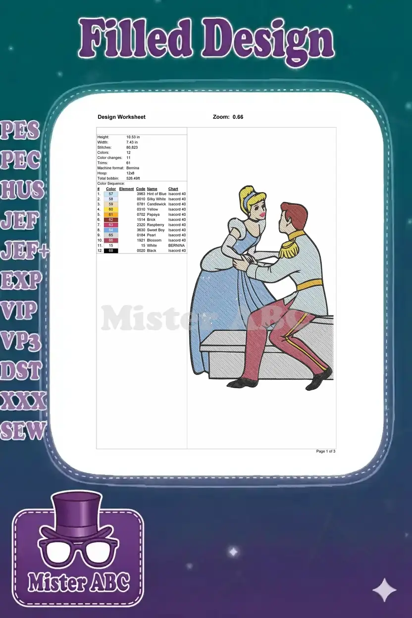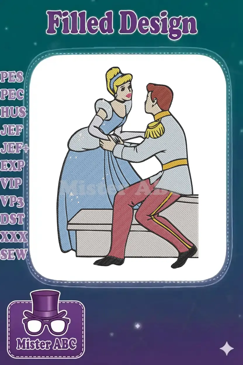 Capture the magic of a timeless fairytale with this enchanting Cinderella and Prince Charming embroidery design.