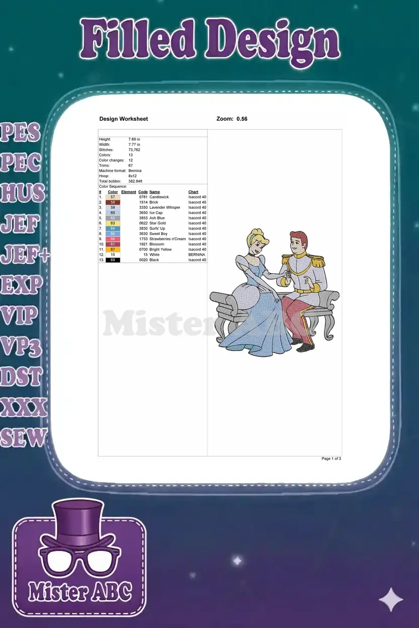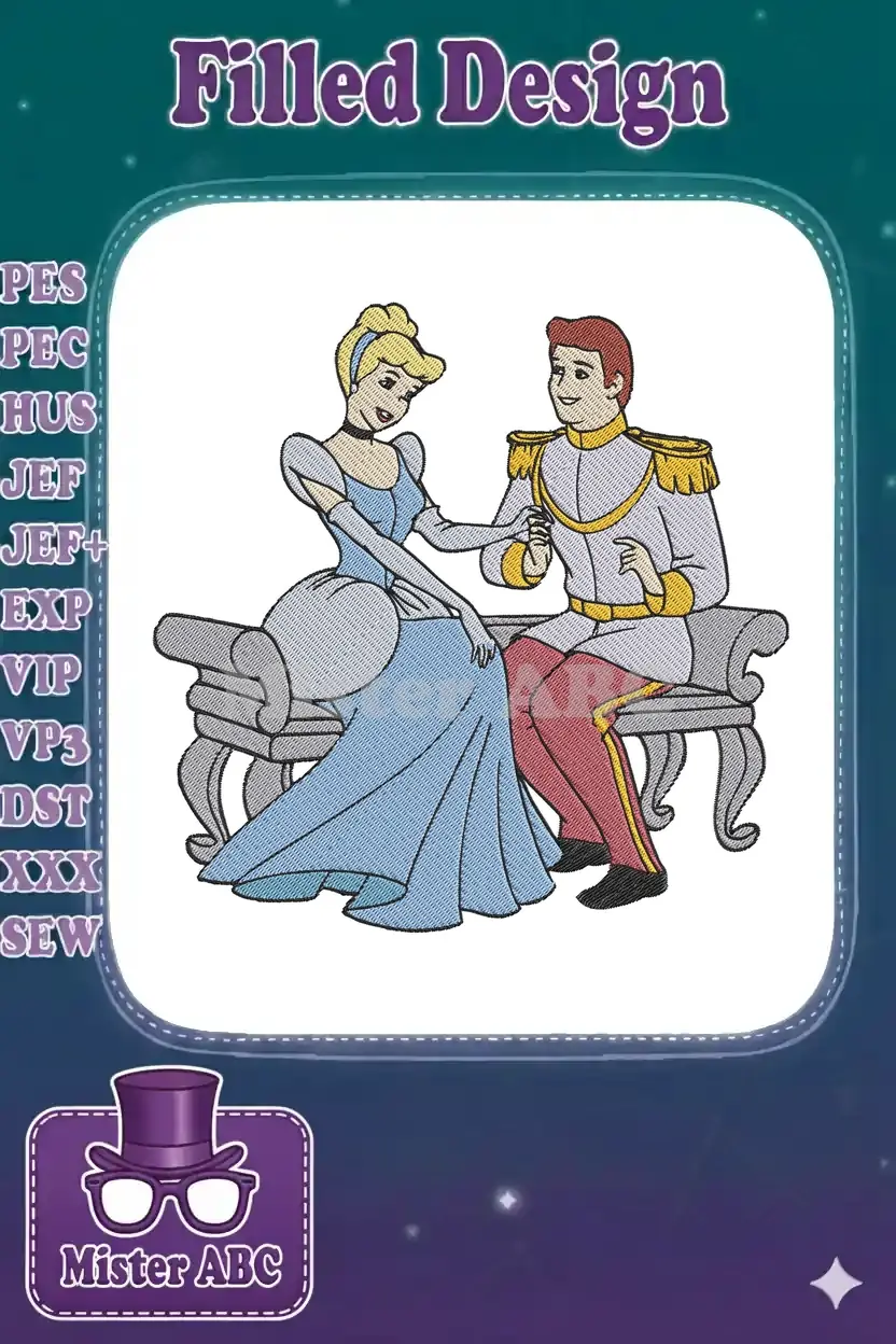 Embrace timeless romance with this exquisite embroidery design featuring Cinderella and her Prince Charming, perfect for enchanting projects.