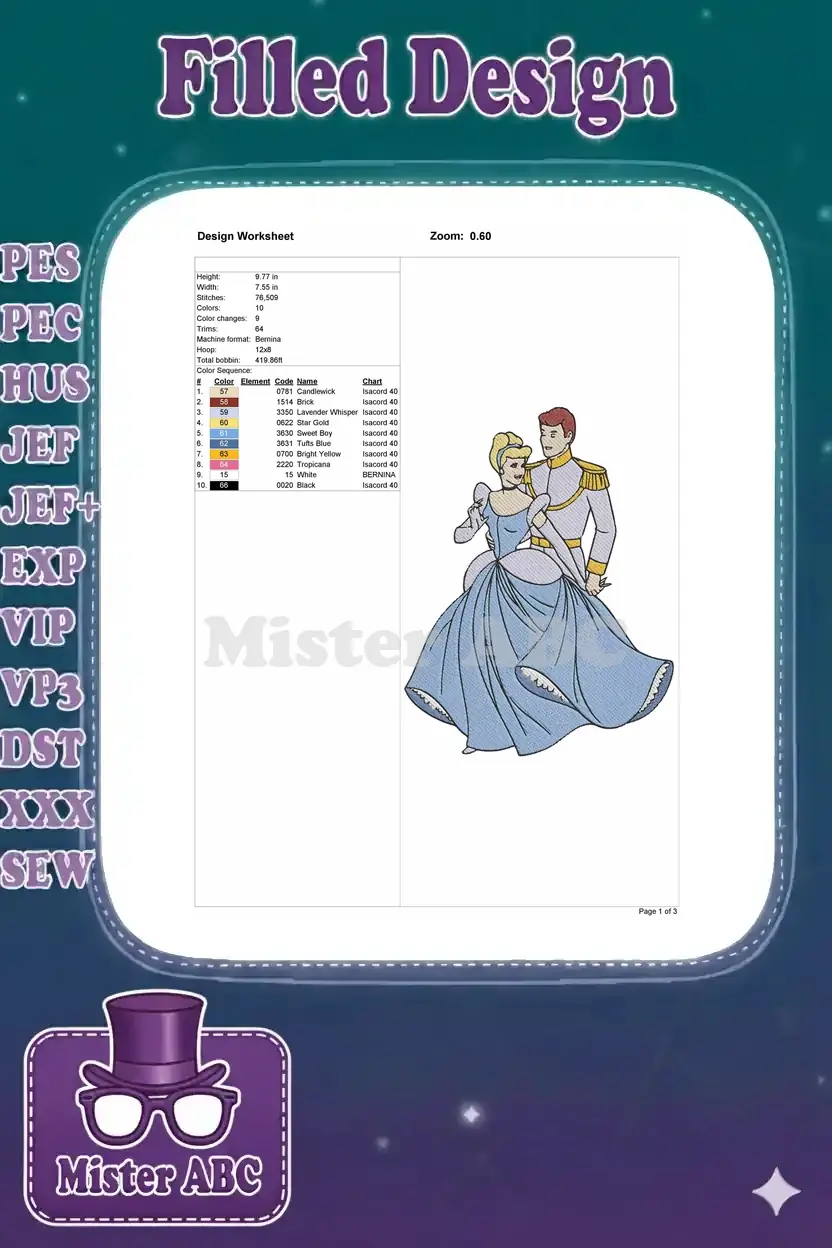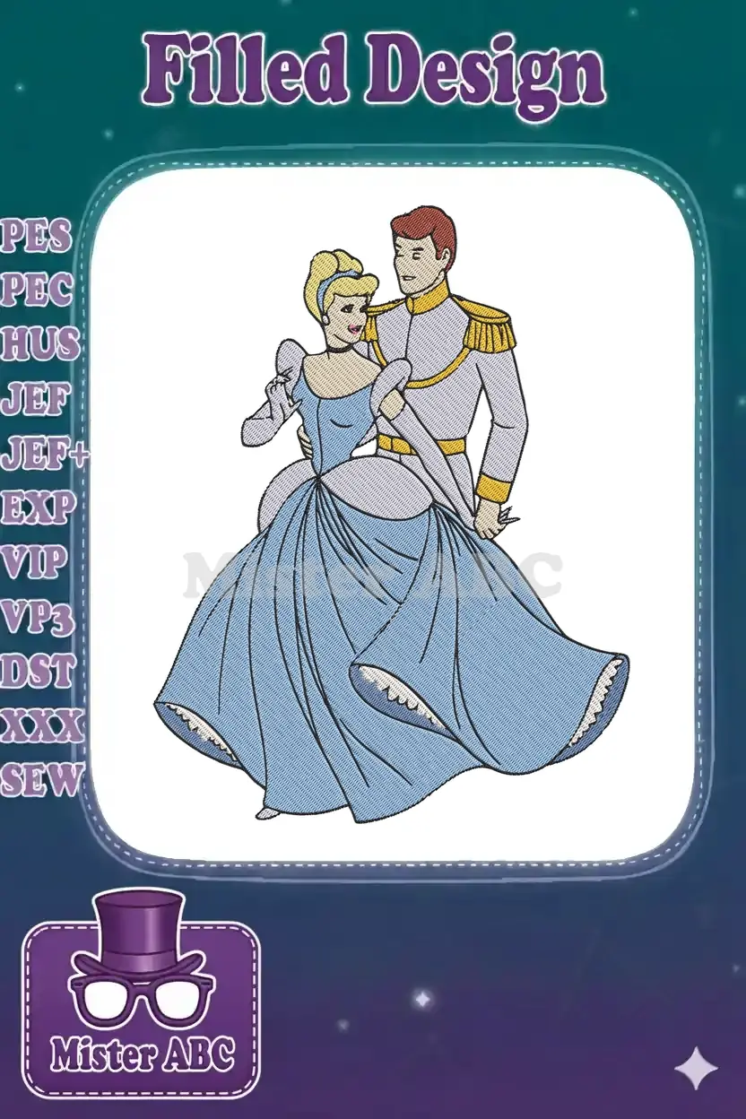 Cinderella and Prince Charming romantic embrace couple embroidery designs