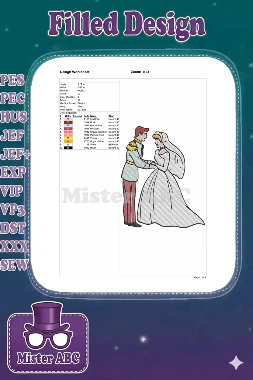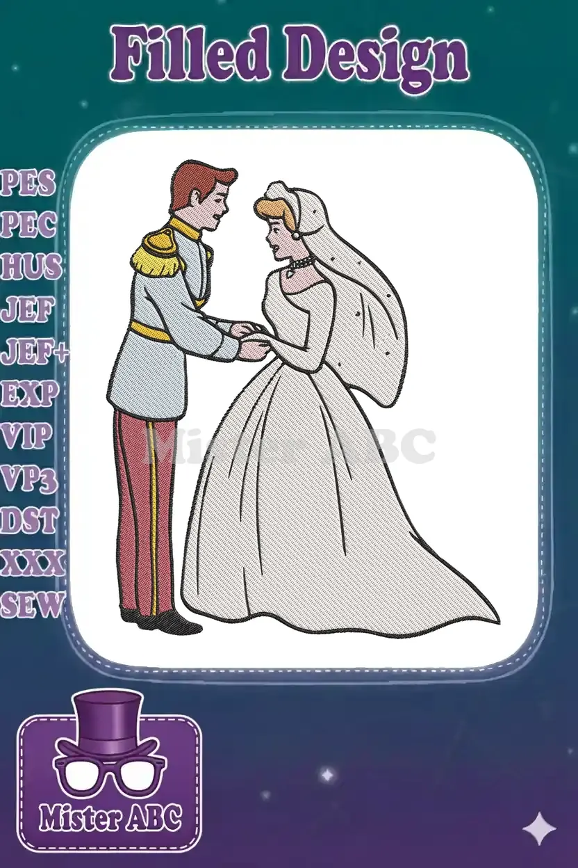 An enchanting embroidery design featuring Cinderella and Prince Charming in their wedding attire. Perfect for fairytale romance.