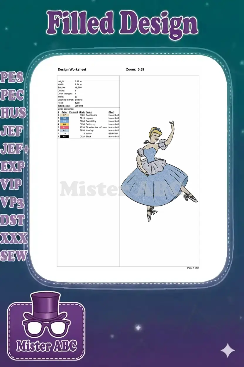 Enchanting Cinderella ballet embroidery design, perfect for adding a touch of fairytale magic and elegance to any project.