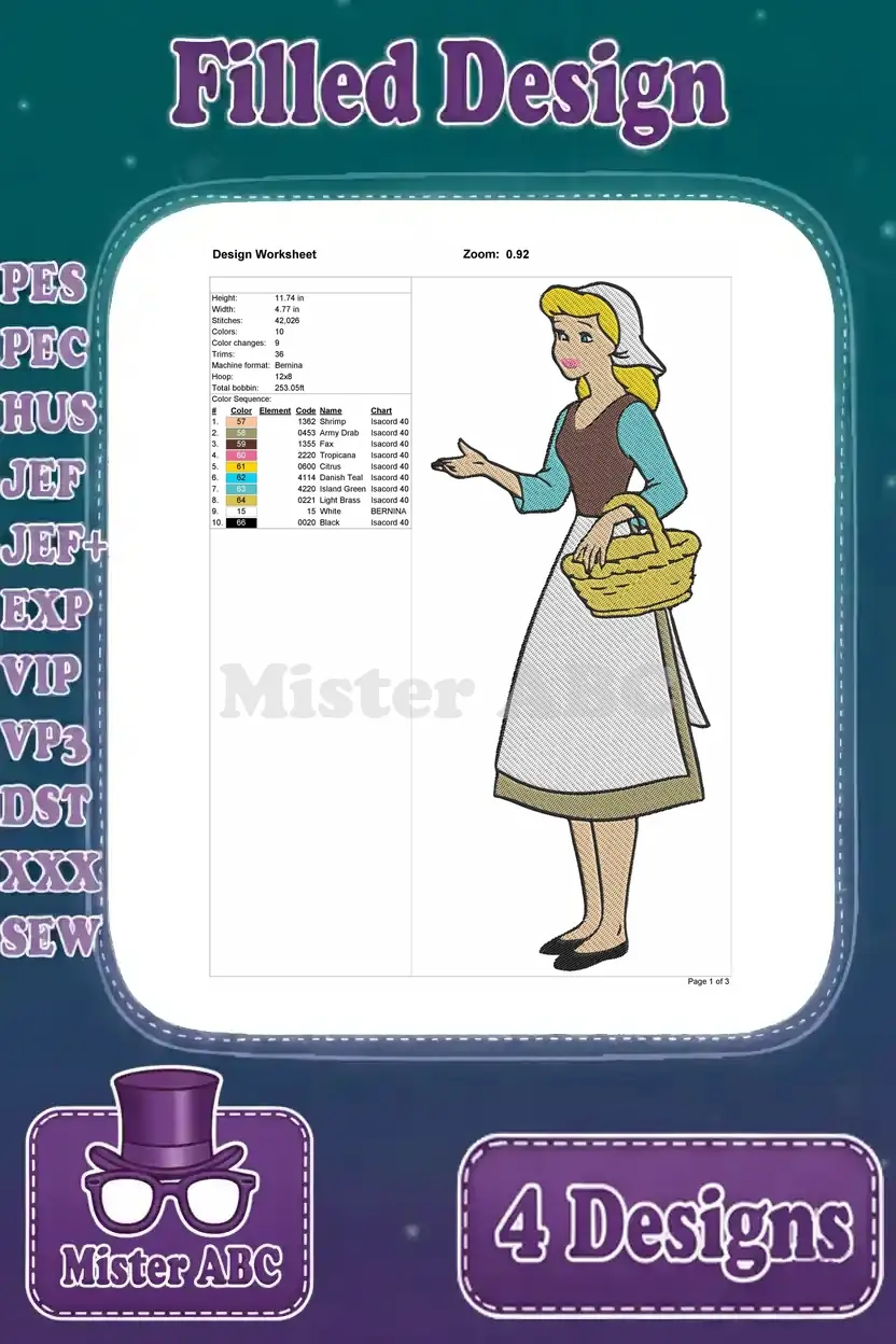 Cinderella In Rags Carrying Basket Serving Tray And Holding Broom – Filled Embroidery Design