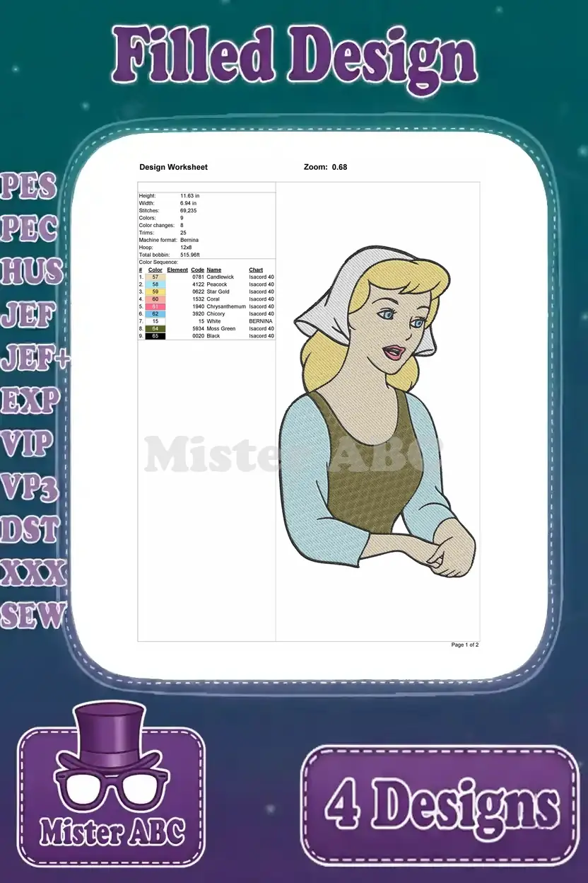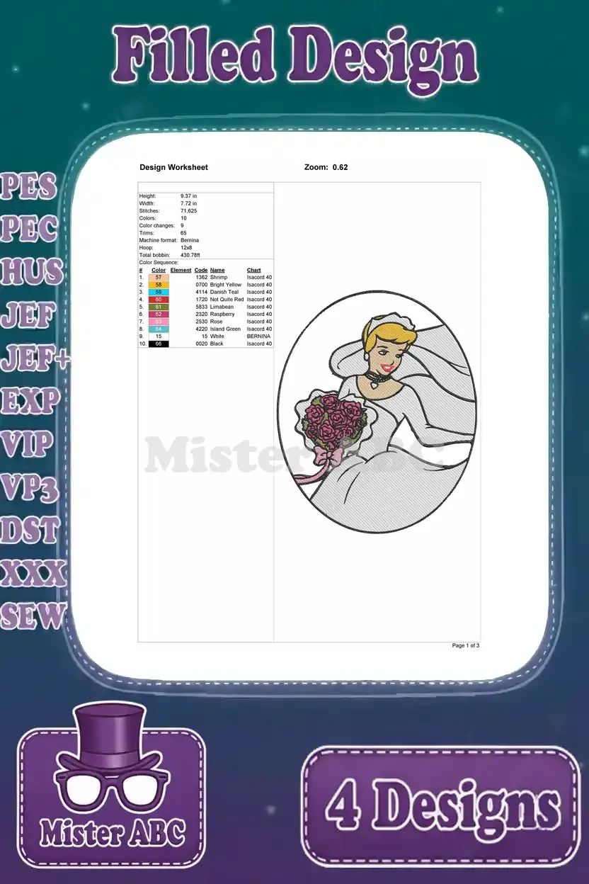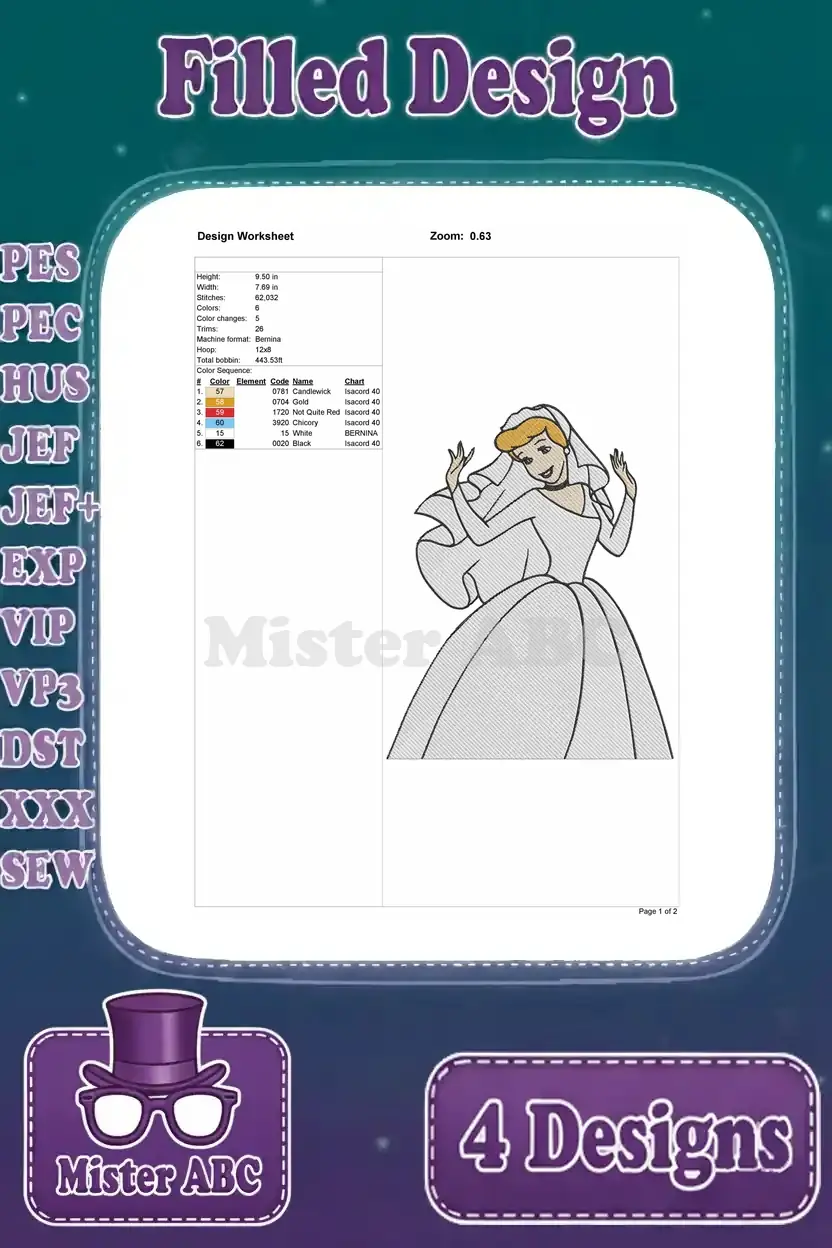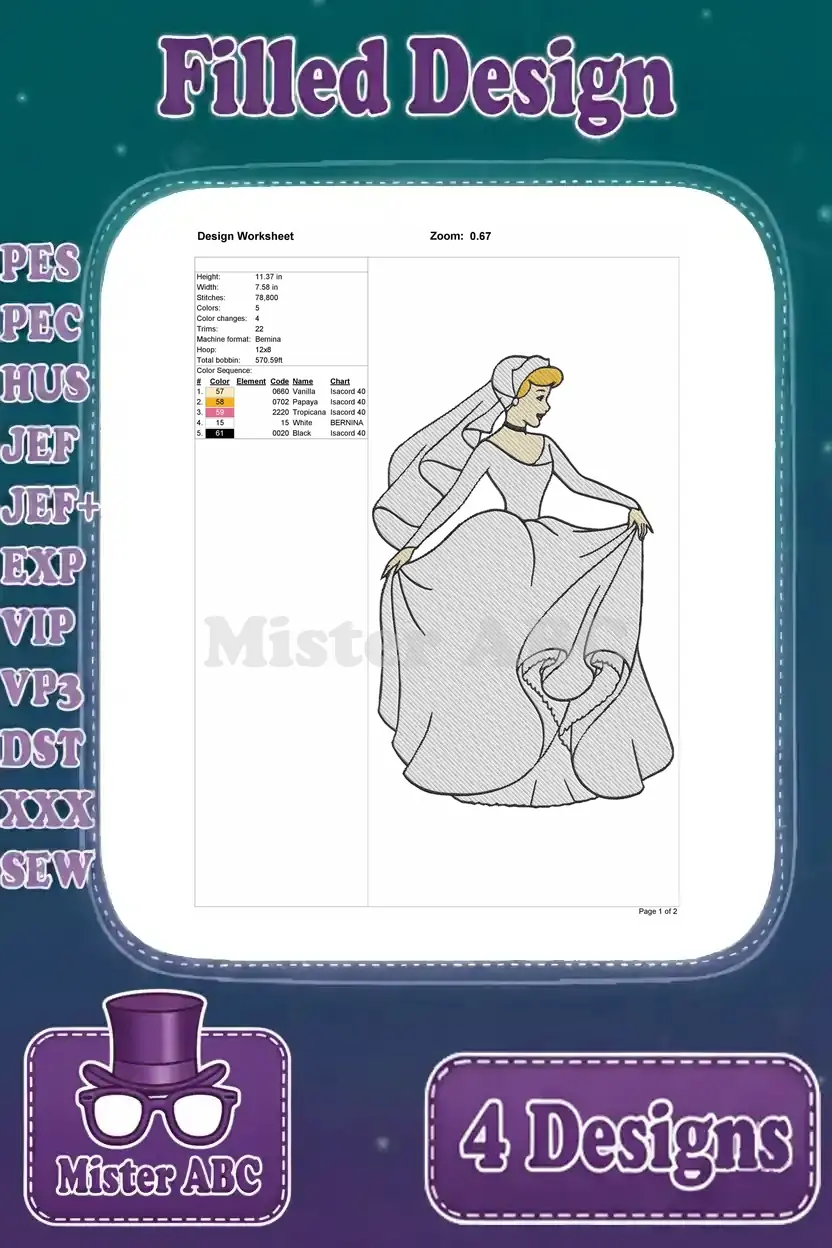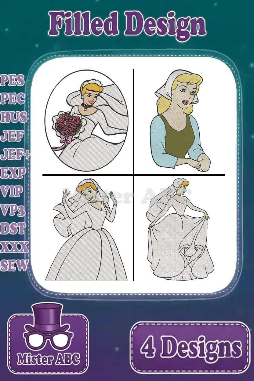Cinderella Rags Portrait Wedding Dress Line And Color Praying Line – Filled Embroidery Design