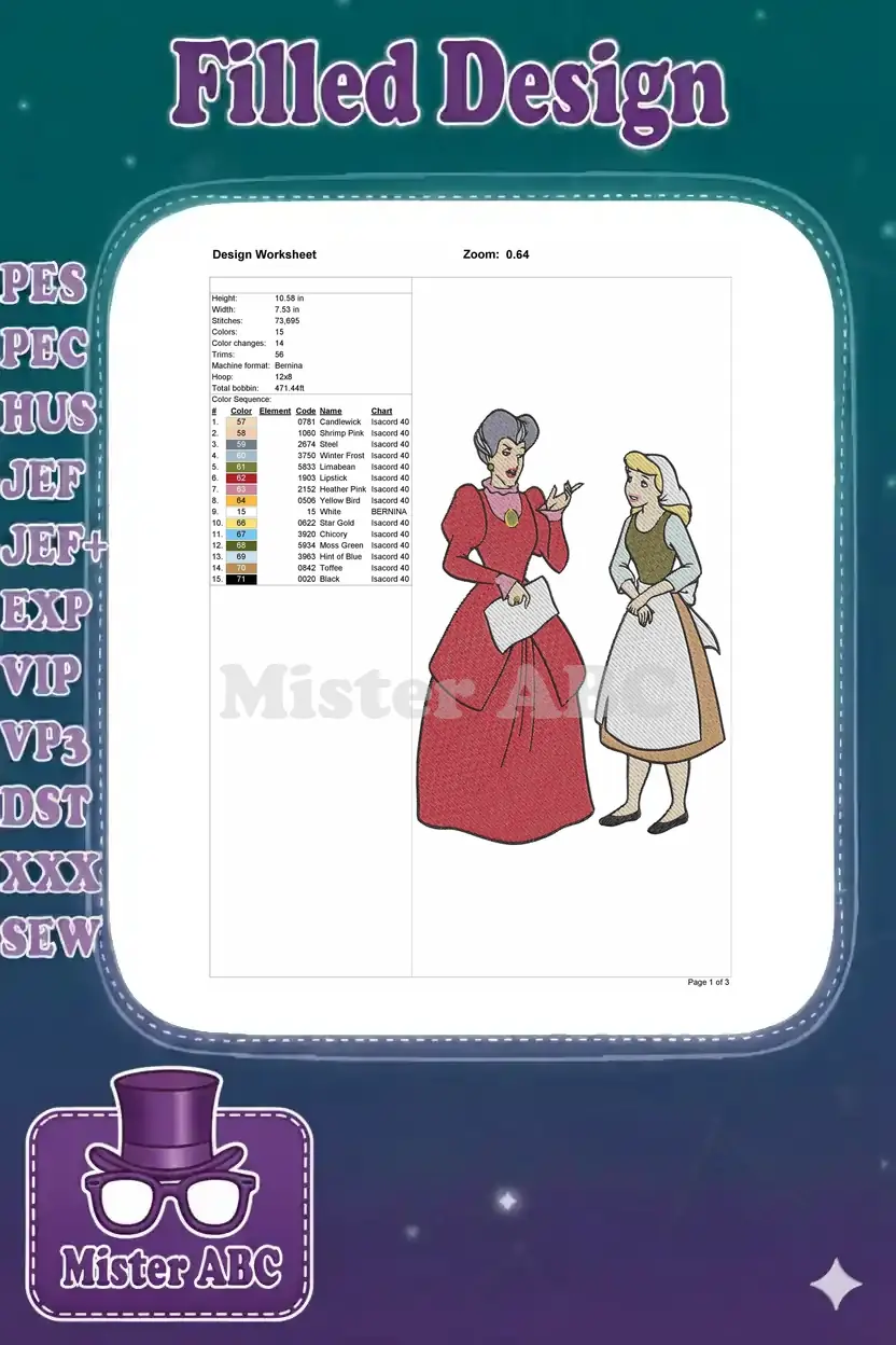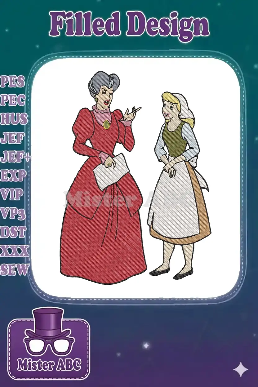 Embroider the iconic scene of Cinderella and Lady Tremaine. A detailed design for classic fairy tale enthusiasts.