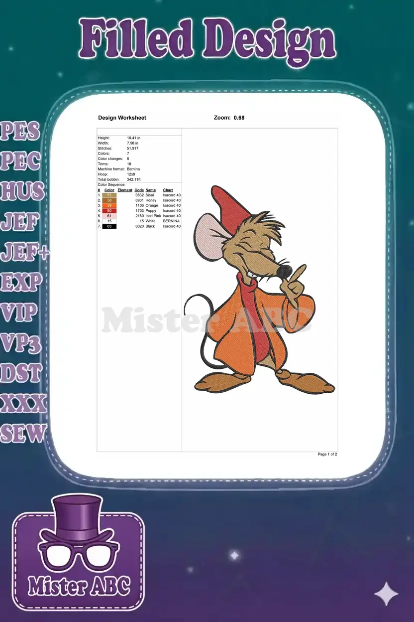 Cinderella’s Jaq Mouse Pointing Happy Cartoon Embroidery Designs