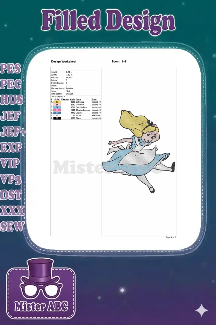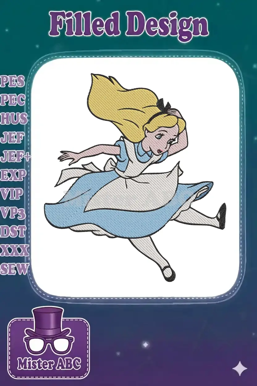 Classic Alice in Wonderland running falling character machine embroidery designs