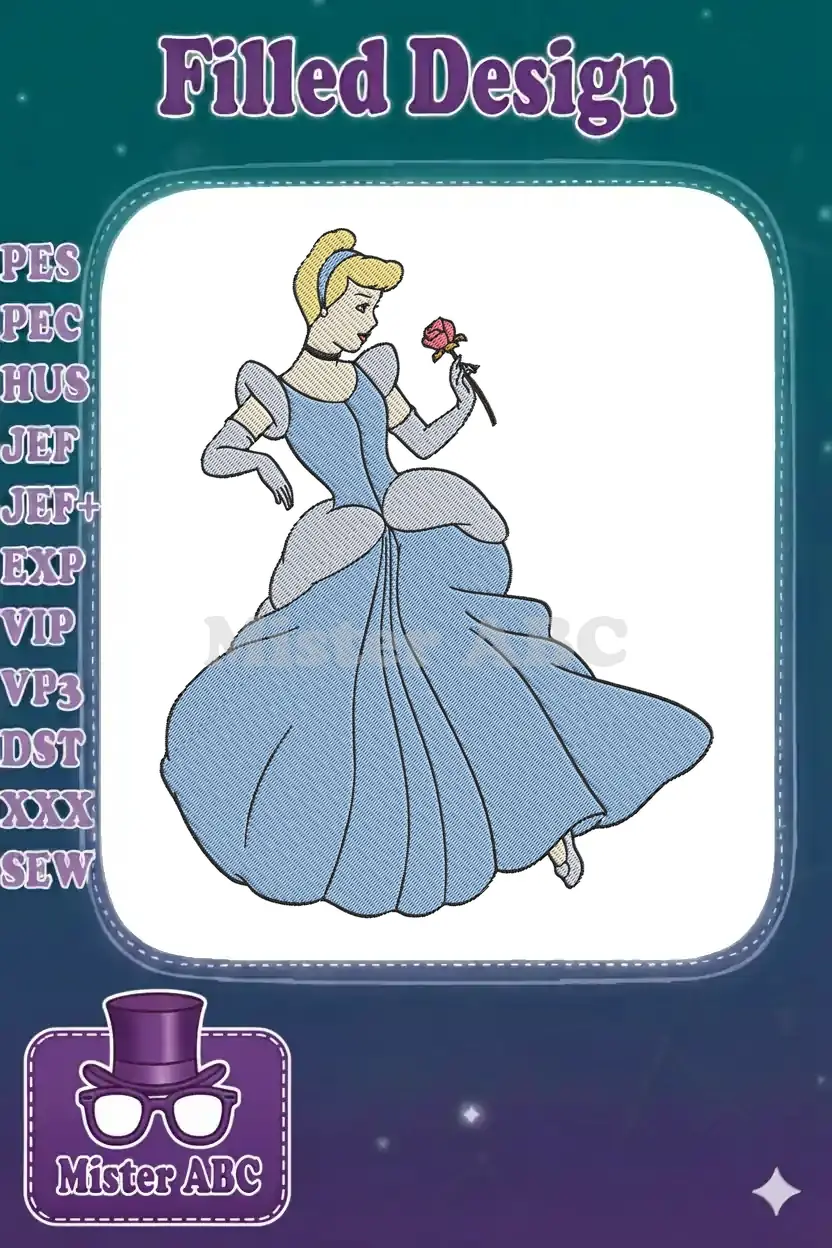 Classic Cinderella in blue ball gown holding rose embroidery designs