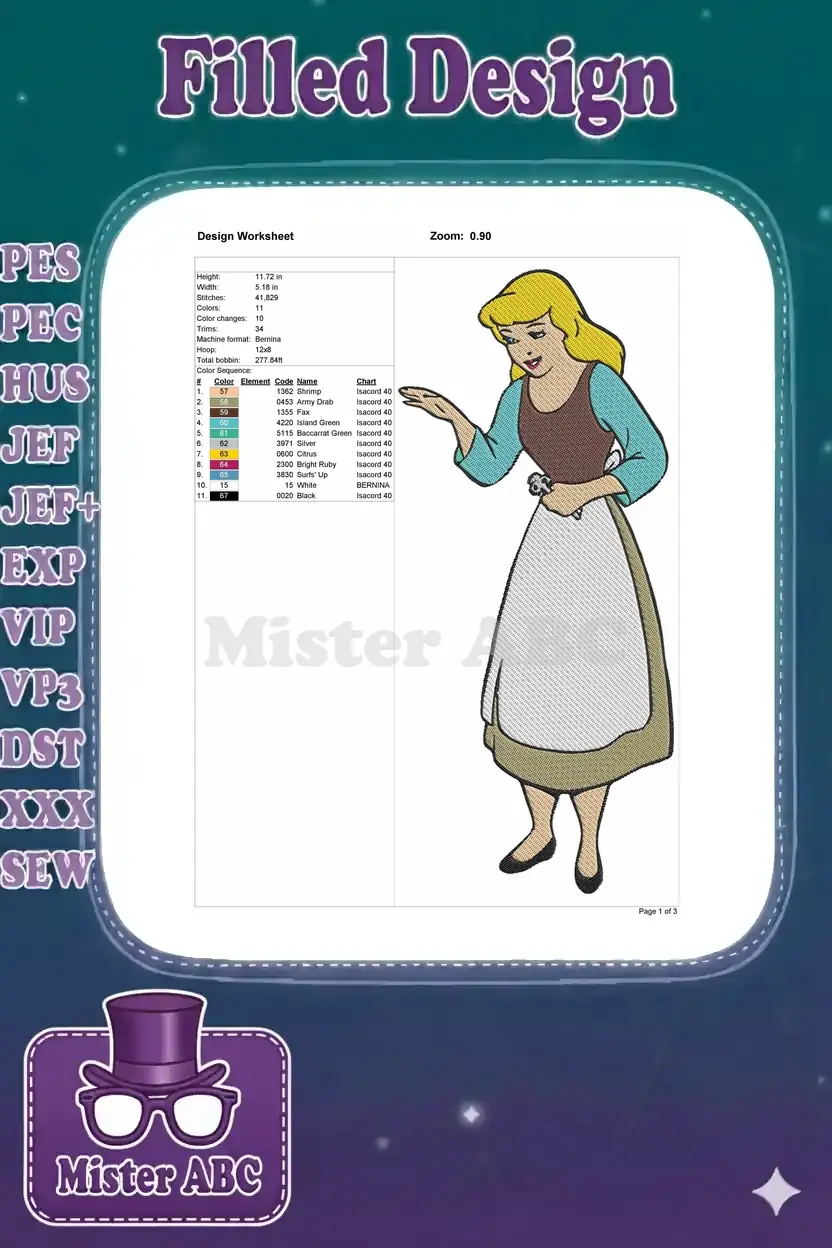 Classic Cinderella maid character embroidery designs for fairytale fans