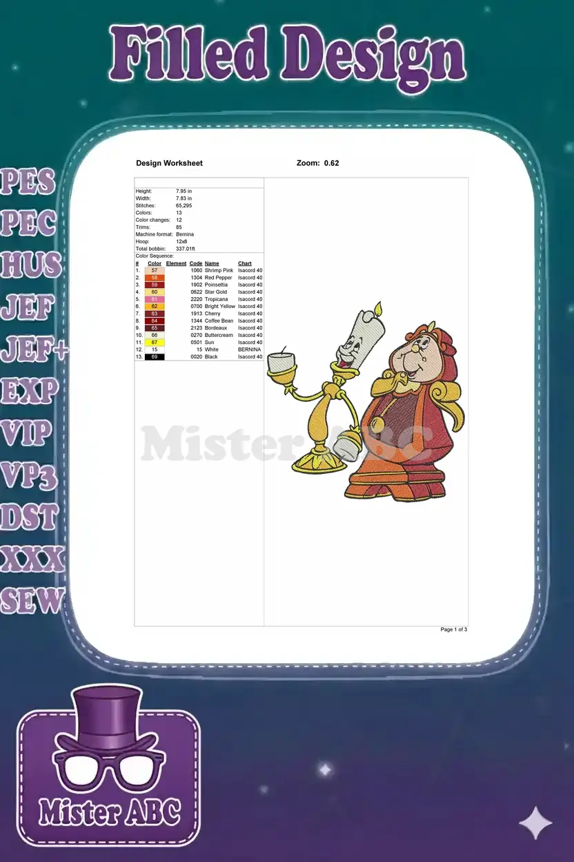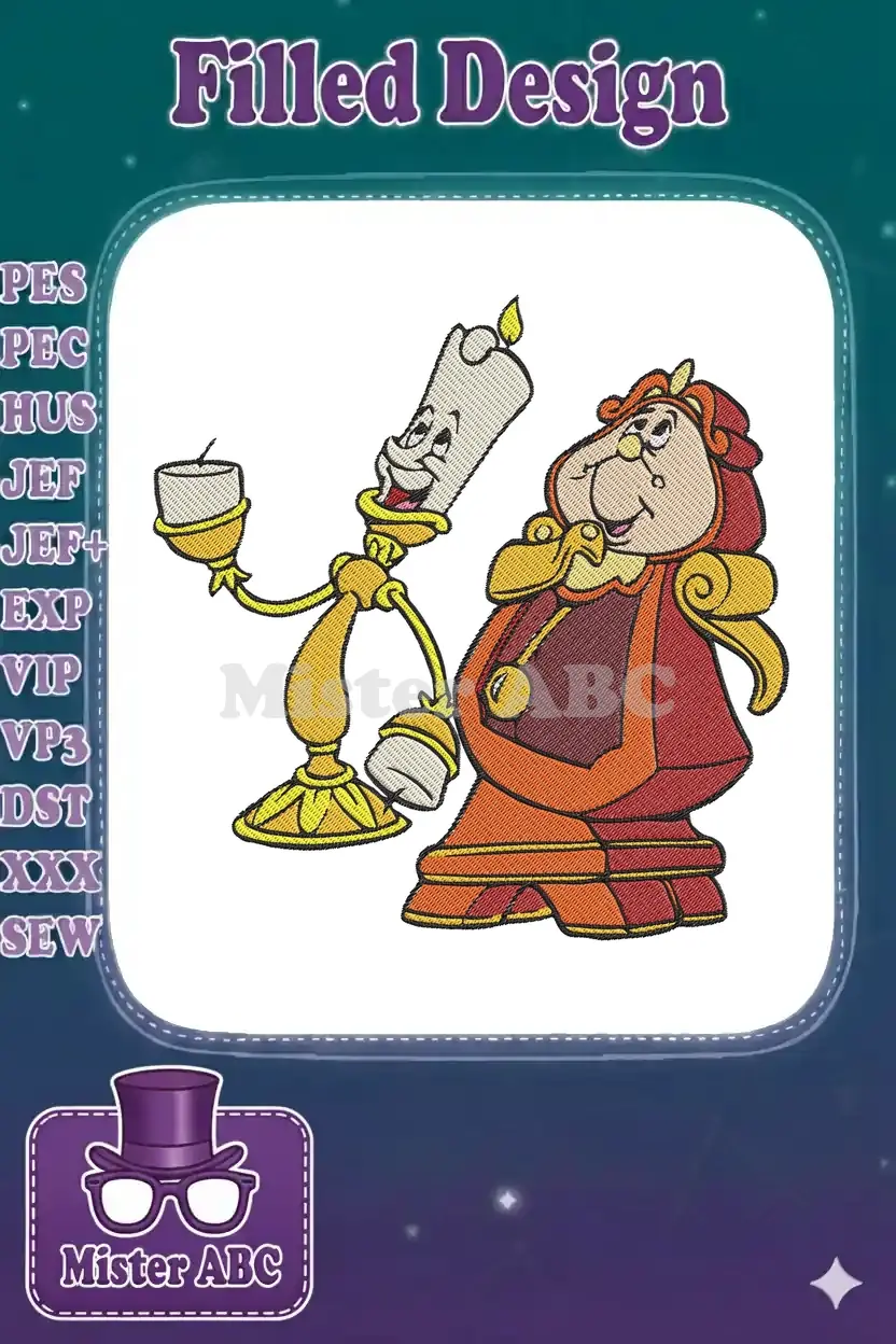 Enchanting Lumiere & Cogsworth embroidery design, perfect for adding classic Disney magic to your projects. Detailed stitches bring these beloved characters to life!