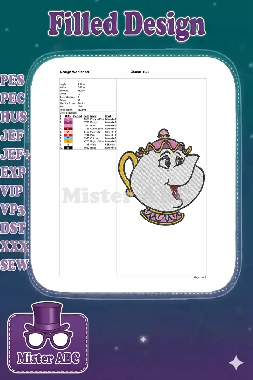 Classic Disney Beauty and Beast Mrs. Potts Teapot Embroidery Designs