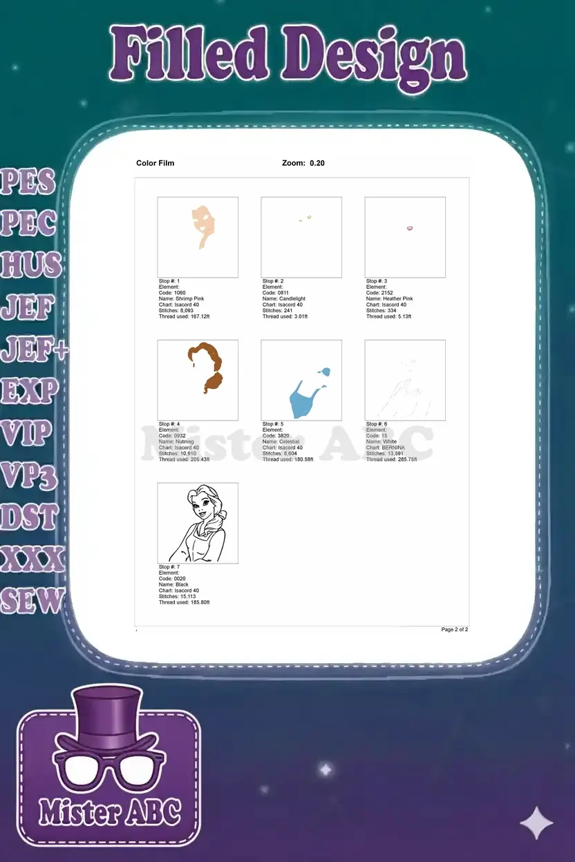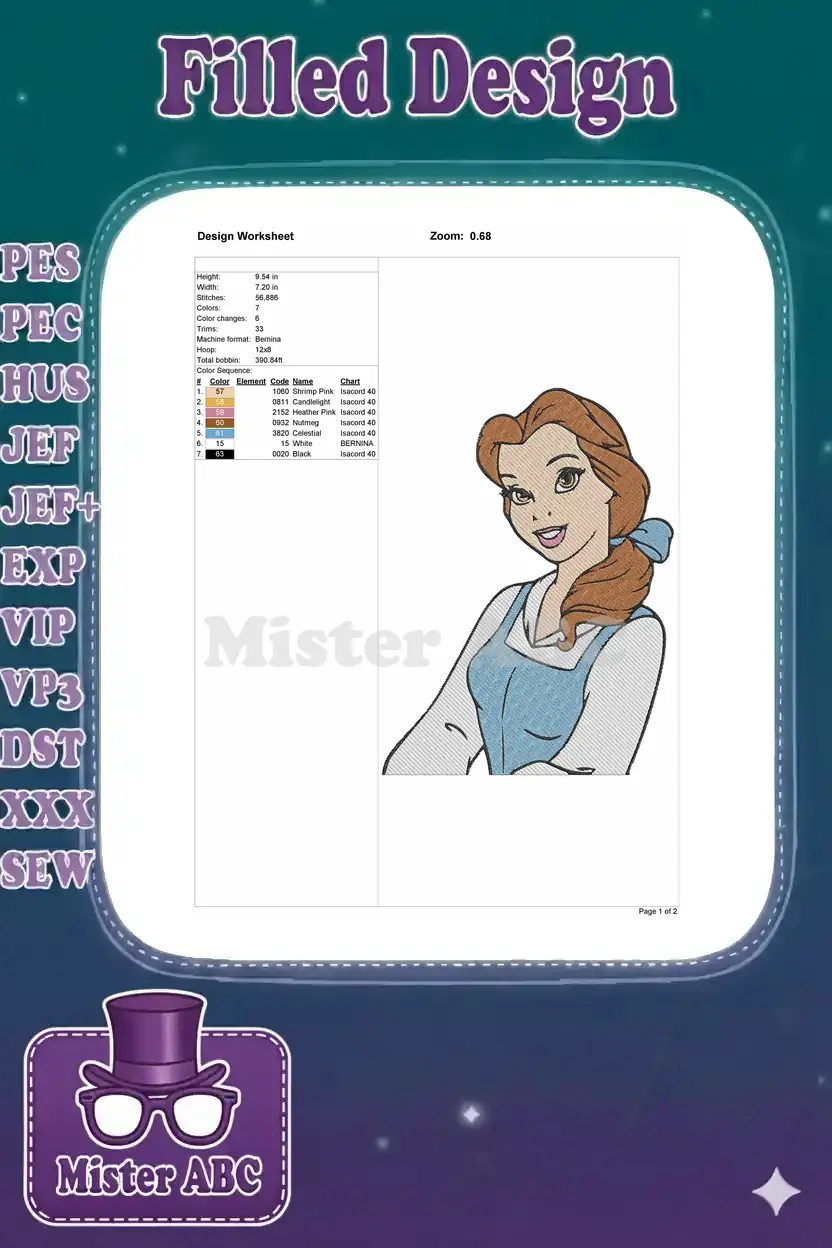 Classic Disney Belle Princess blue peasant dress embroidery designs