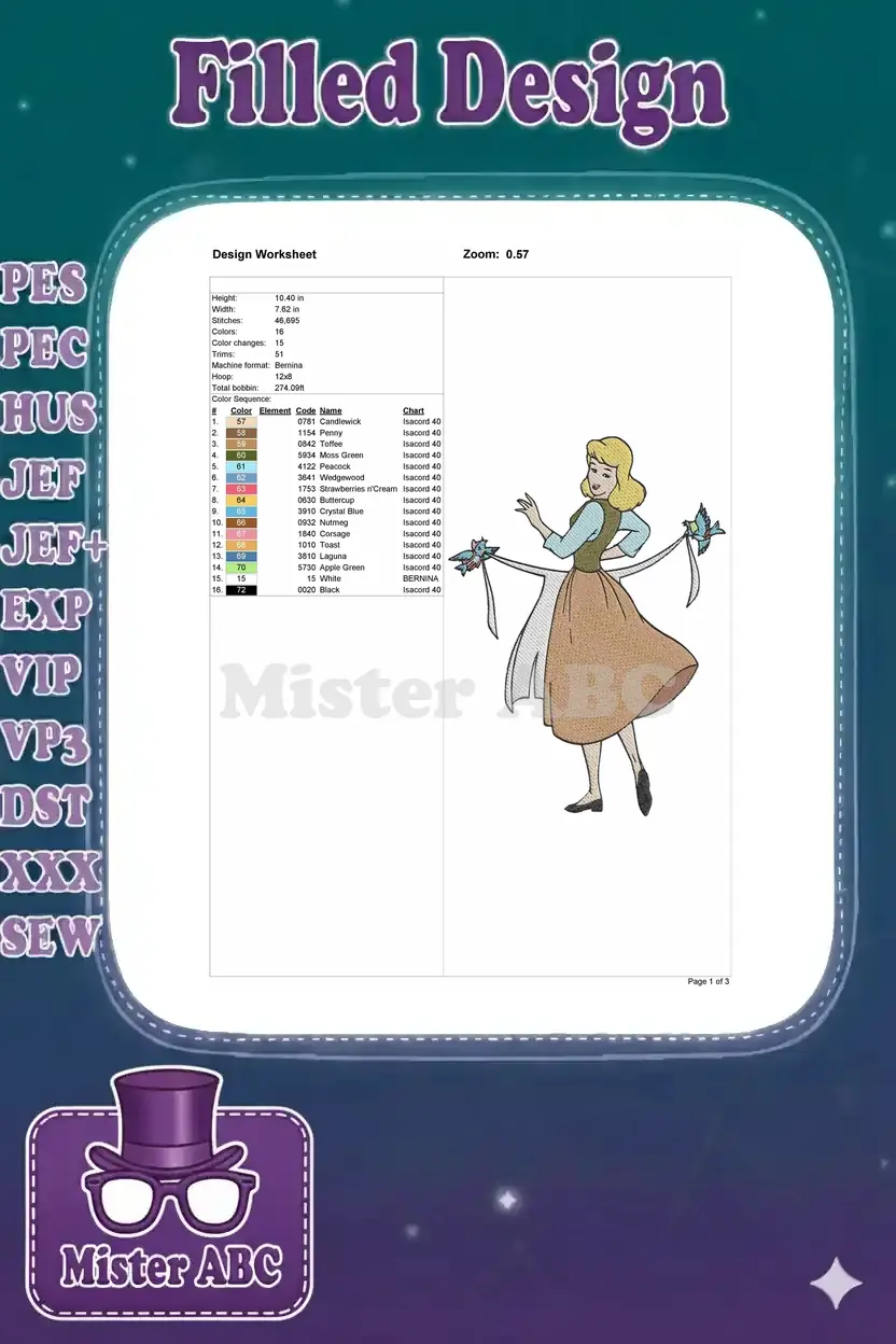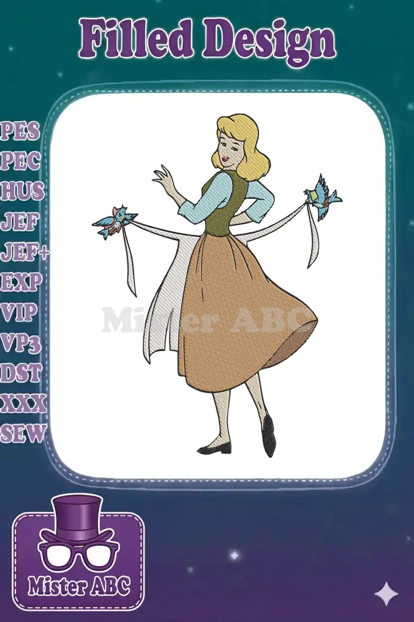 Classic Disney Cinderella Maid with Friendly Birds Helping Embroidery Designs