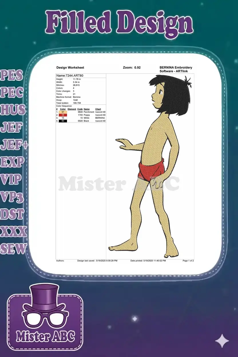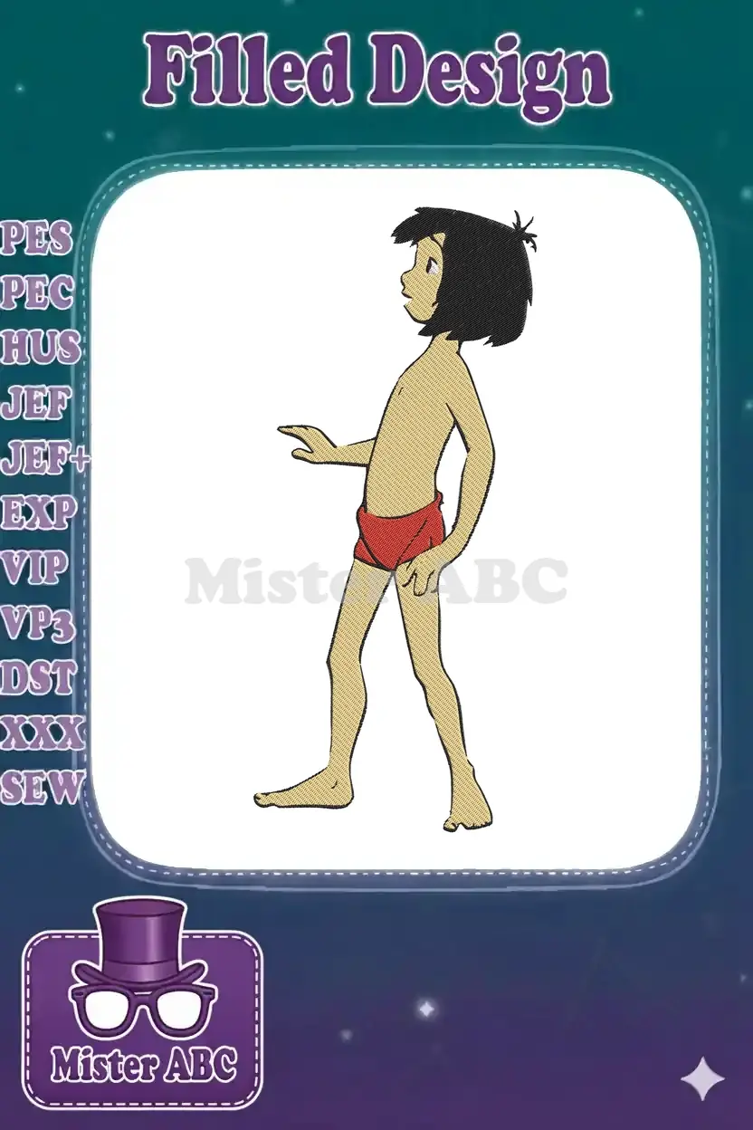 Bring the adventurous spirit of Mowgli to life with this vibrant embroidery design. Perfect for fans of The Jungle Book!