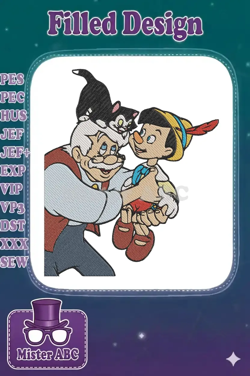Classic Disney Pinocchio Gepetto and Figaro family moment embroidery designs