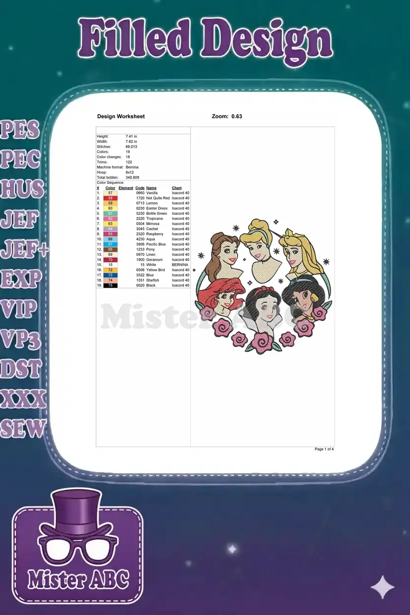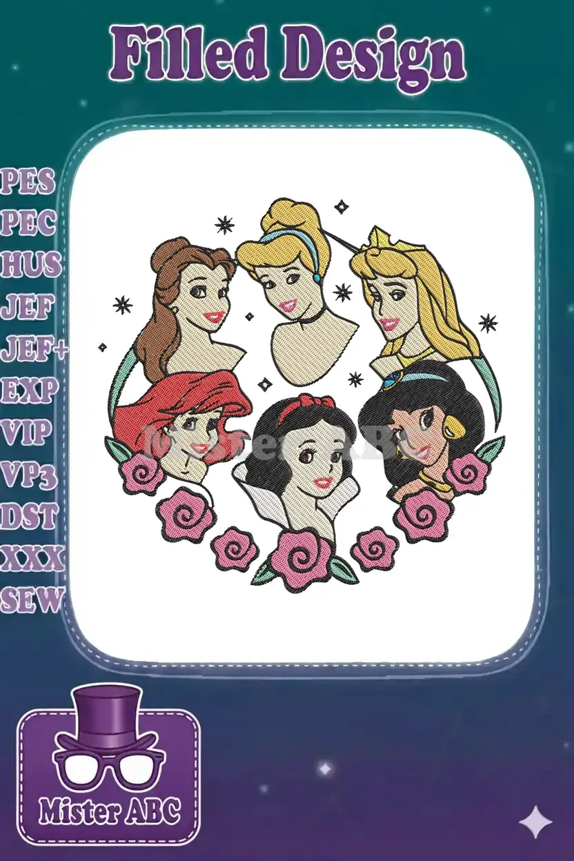 Enchanting embroidery design featuring six iconic princesses, perfect for adding a touch of magic to any item.