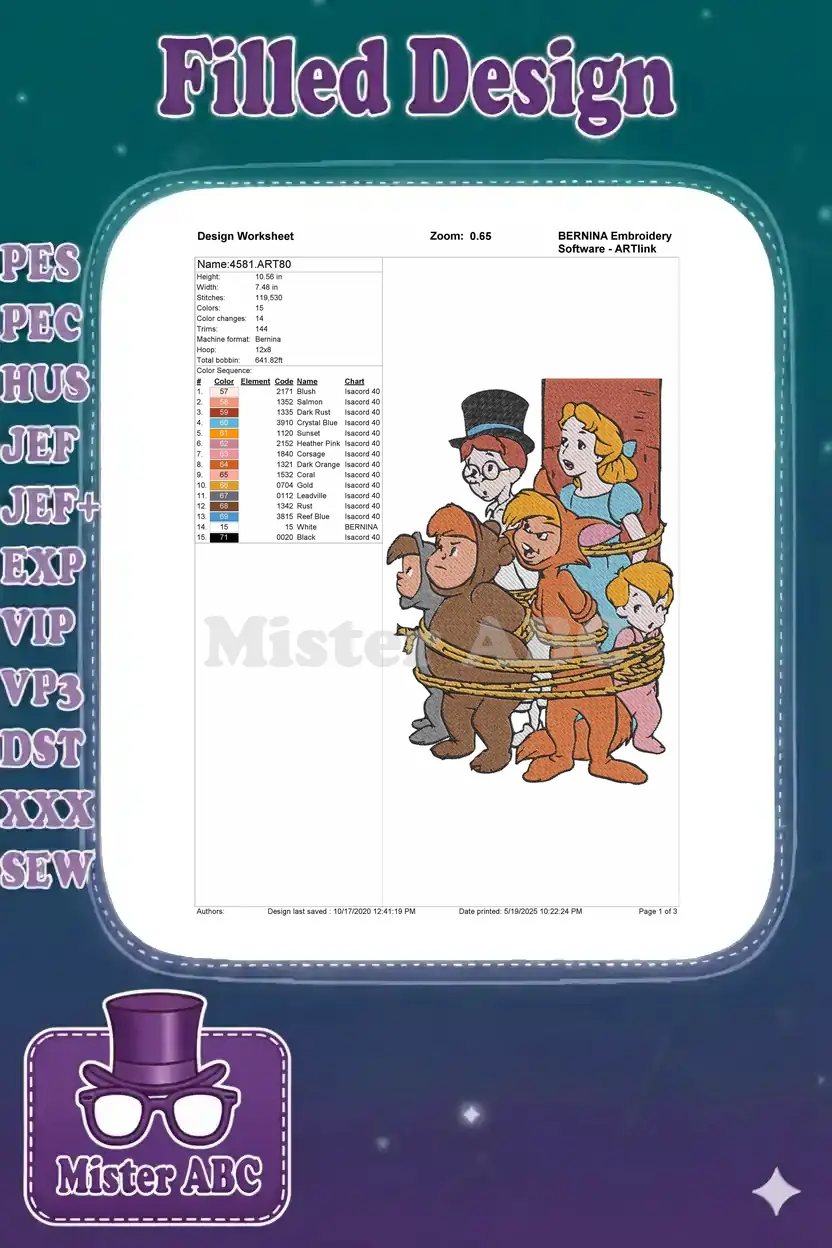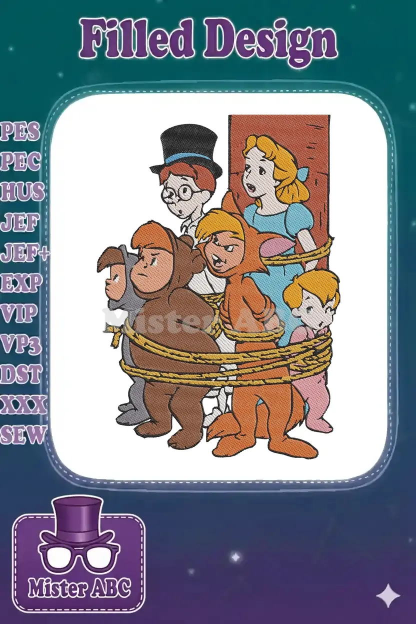 A vibrant embroidery design depicting classic characters from Neverland, playfully tied up. Perfect for fans of adventure.