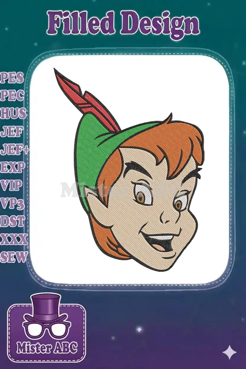 Classic Peter Pan happy boy embroidery designs with red feather hat