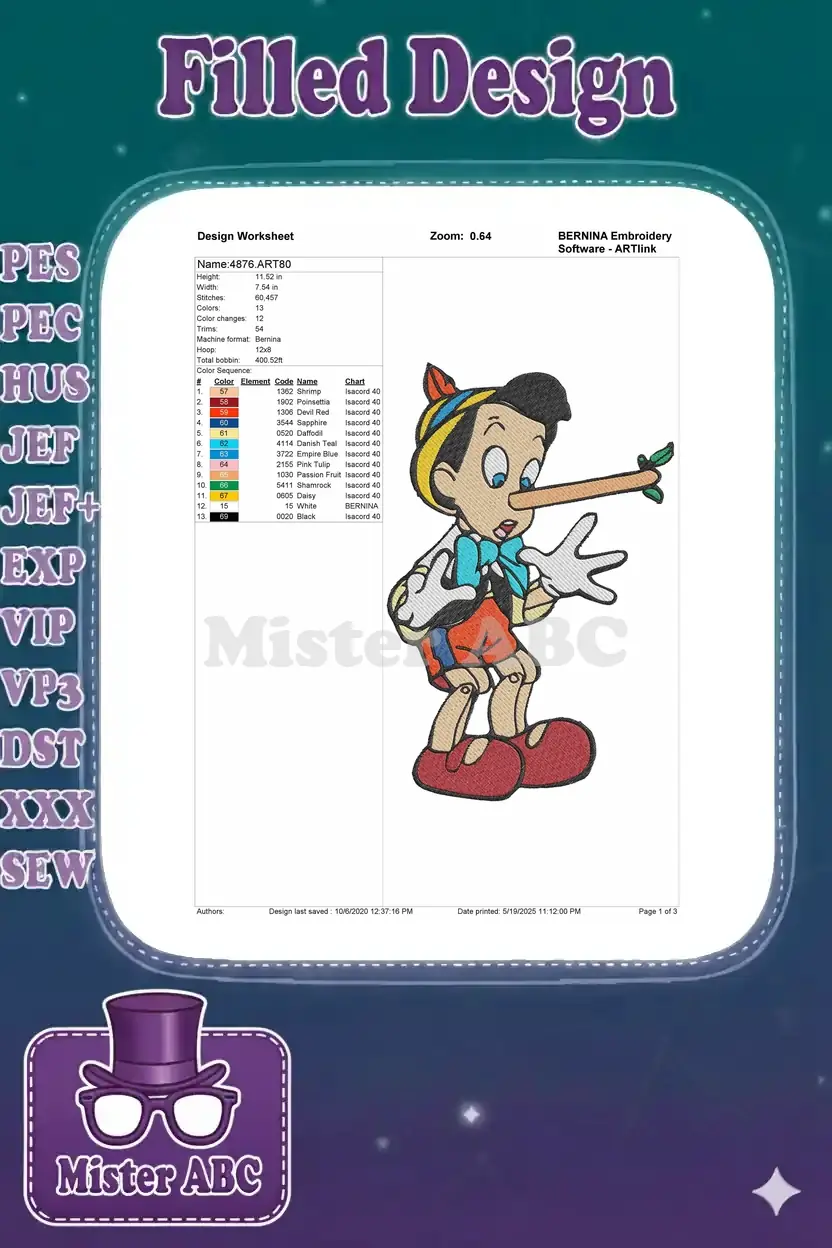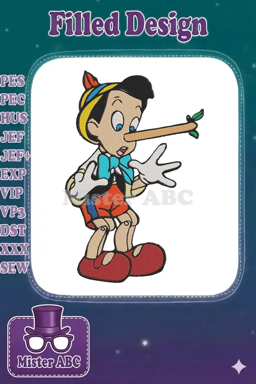 Classic Pinocchio Character Lying with Long Nose Embroidery Designs