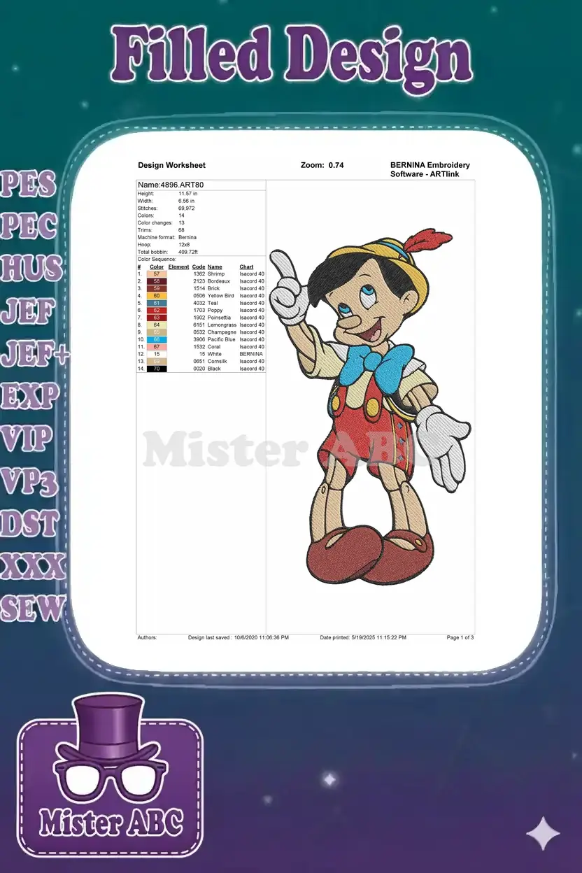 Classic Pinocchio happy puppet pointing up embroidery designs