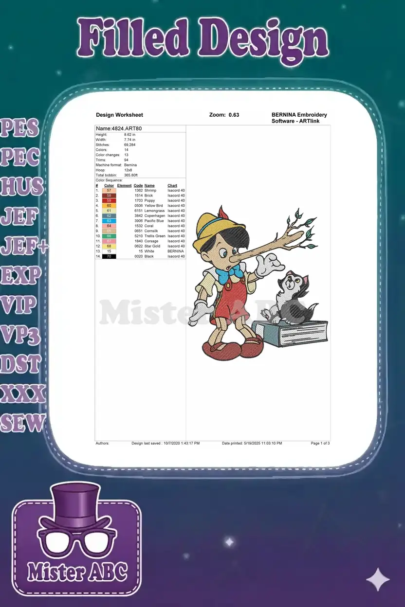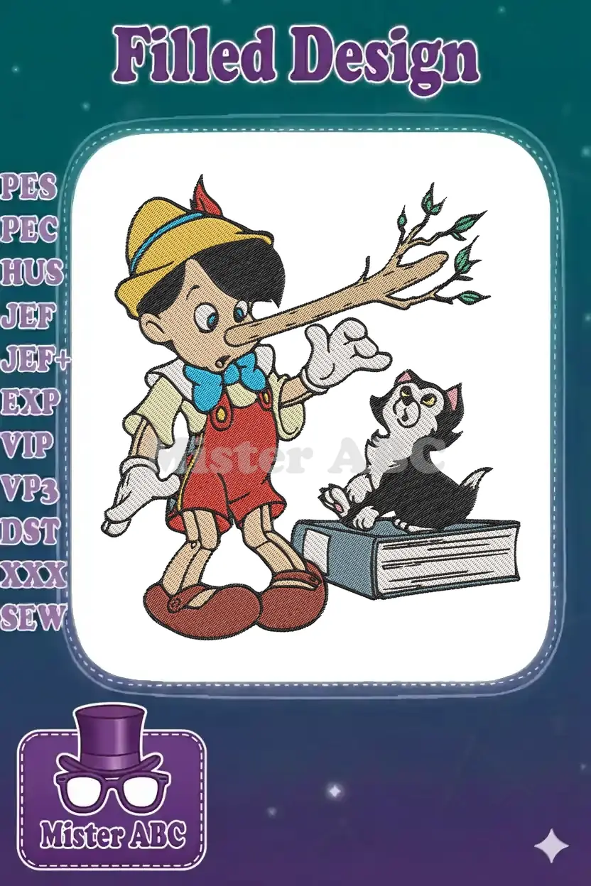 Classic Pinocchio Lying with Figaro Cat on Books Embroidery Designs