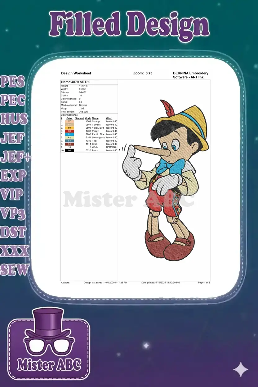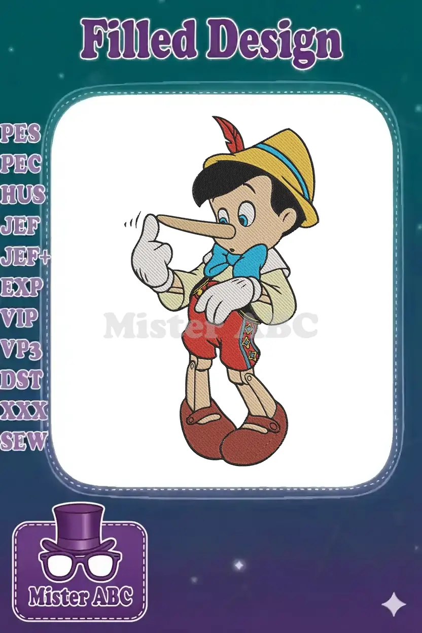 Classic Pinocchio Puppet Character Long Nose Embroidery Designs