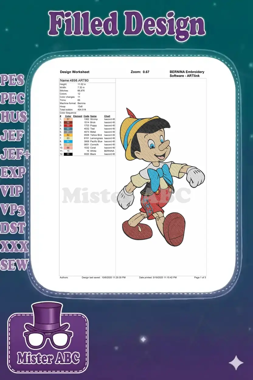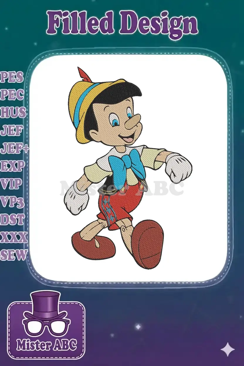 Classic Pinocchio smiling joyful walking Disney cartoon embroidery designs