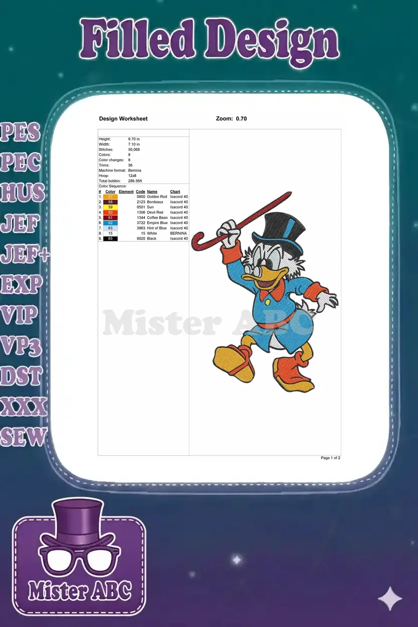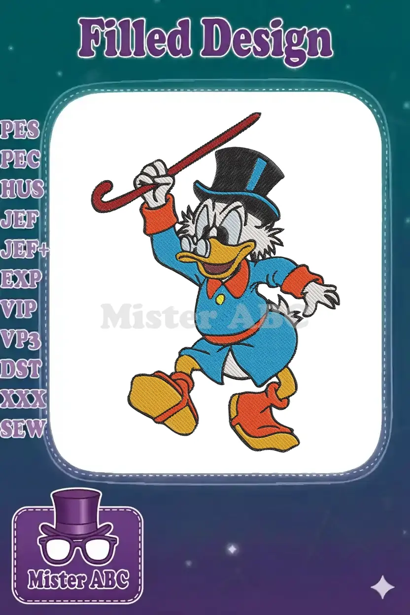 Classic Scrooge McDuck wealthy duck marching with cane embroidery designs
