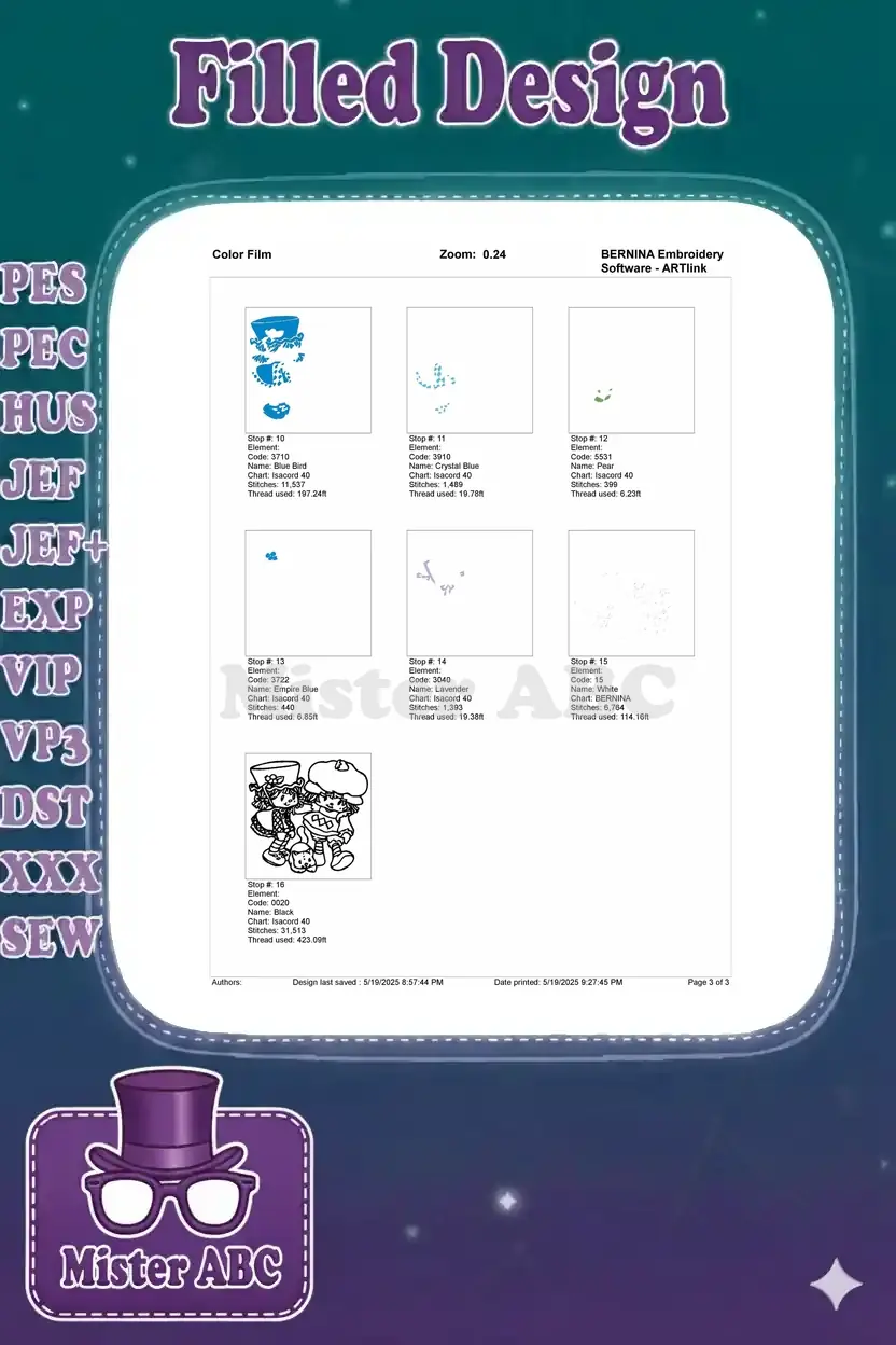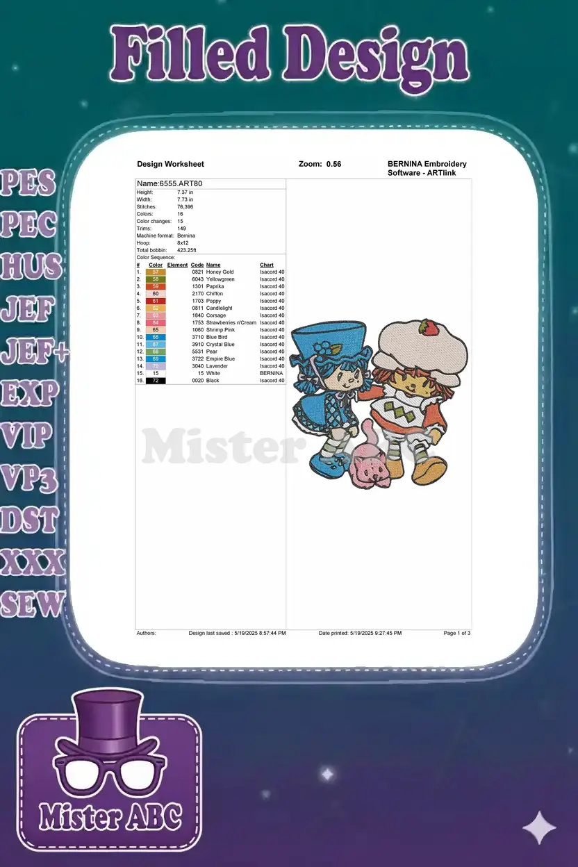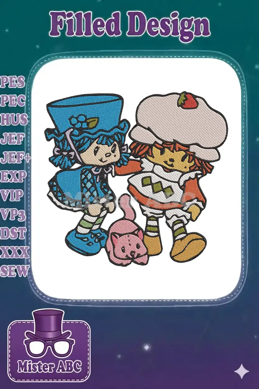 Charming embroidery design of Strawberry Shortcake, Blueberry Muffin, and Custard. Ideal for nostalgic crafts.