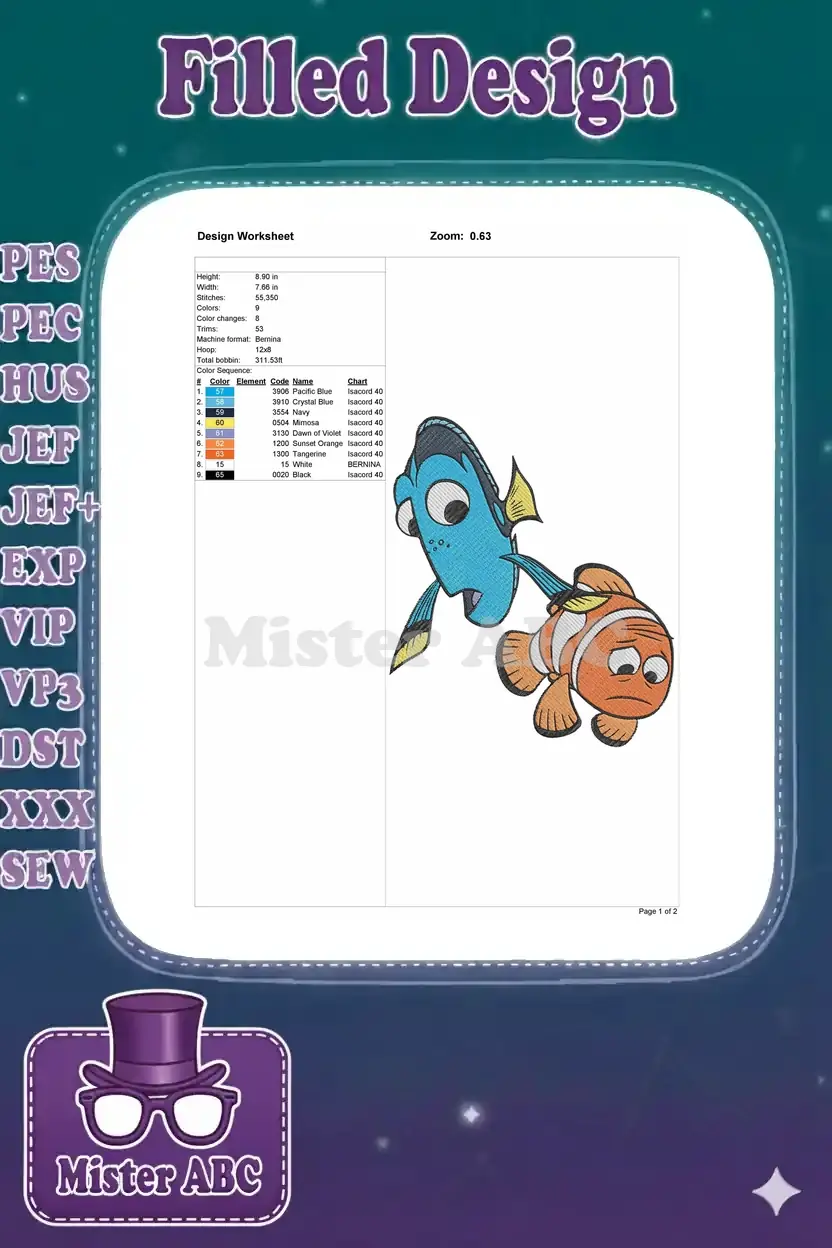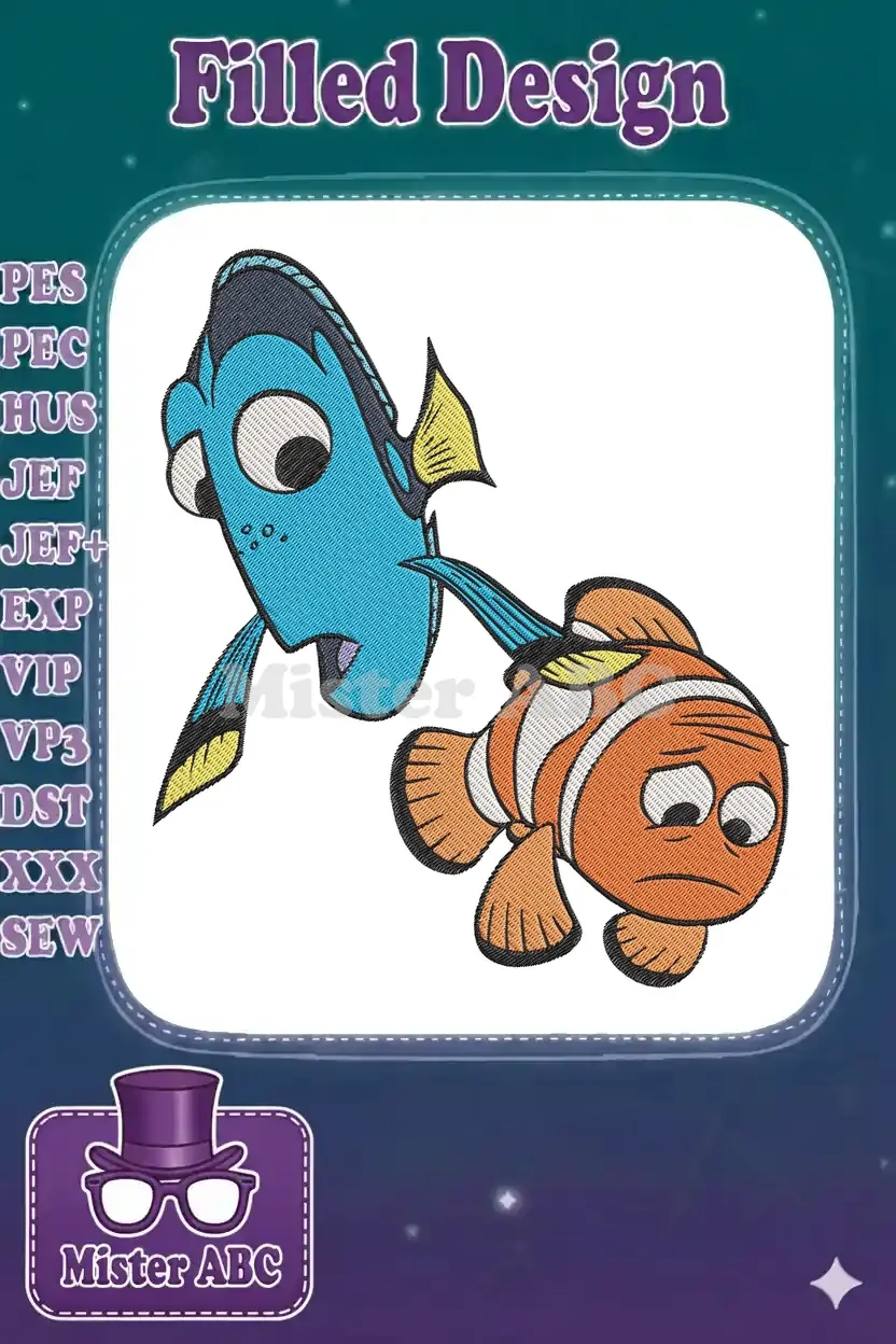 Concerned Dory and Sad Nemo Clownfish Blue Tang embroidery designs