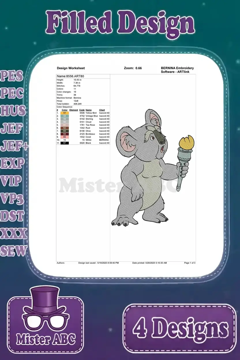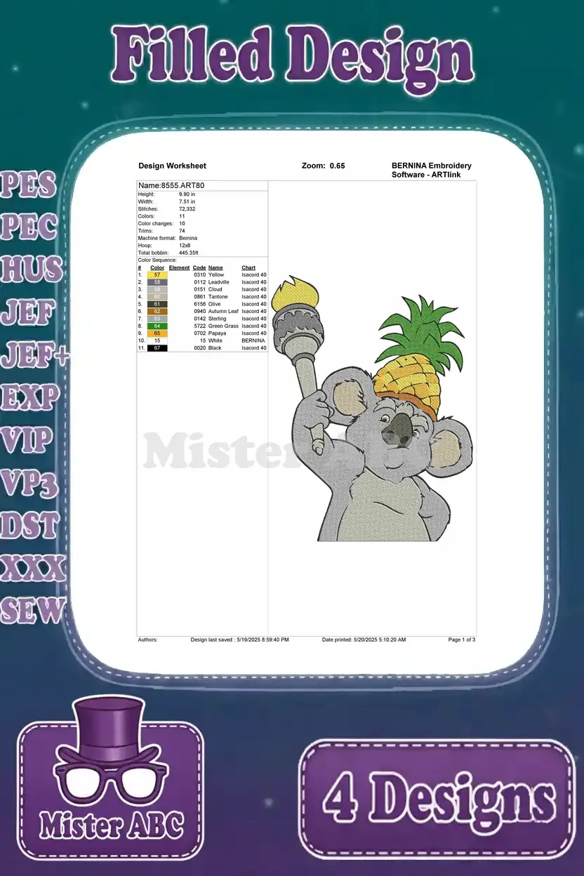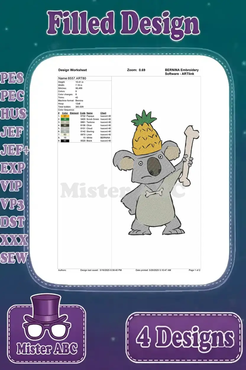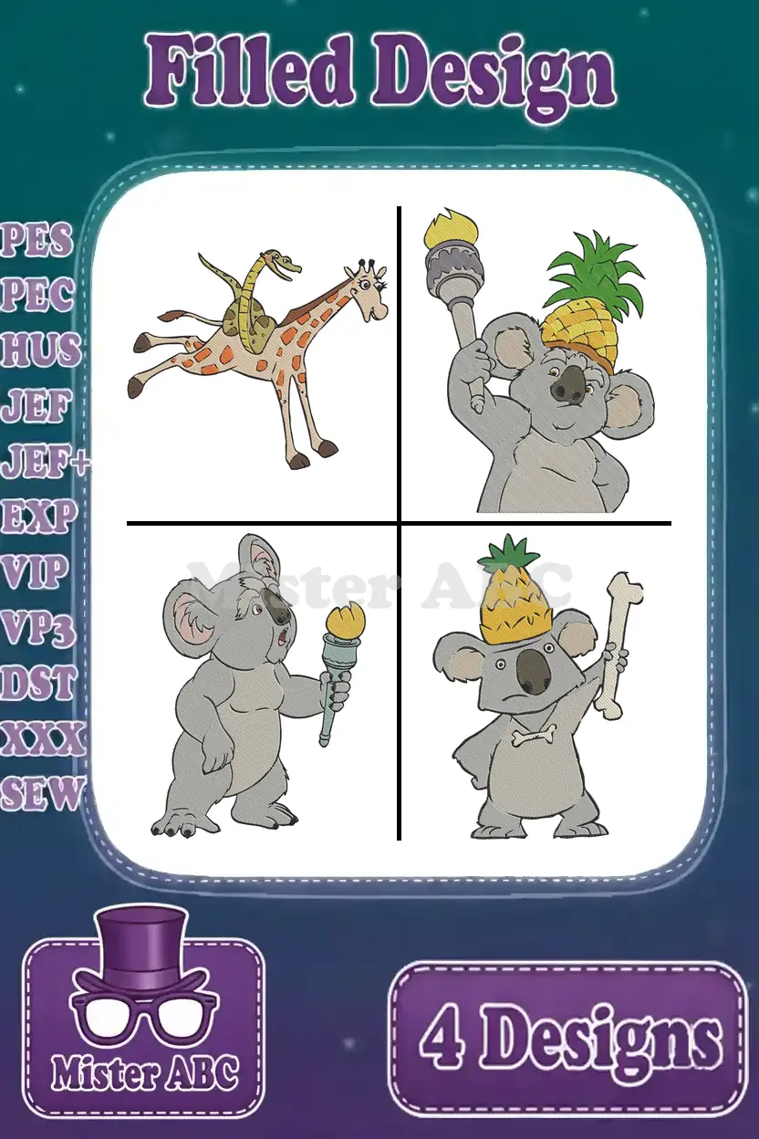 Coon Koala With Ice Cream And Pineapple – Giraffe And Dragonfly – Summer Fun Animals – Filled Embroidery Design