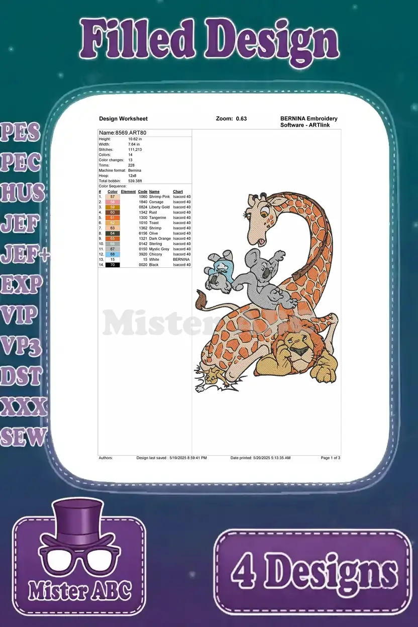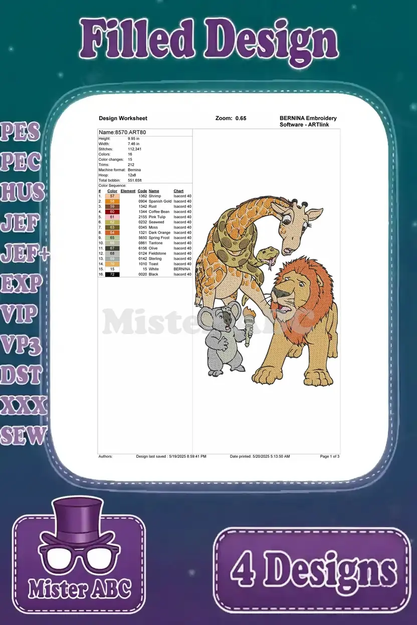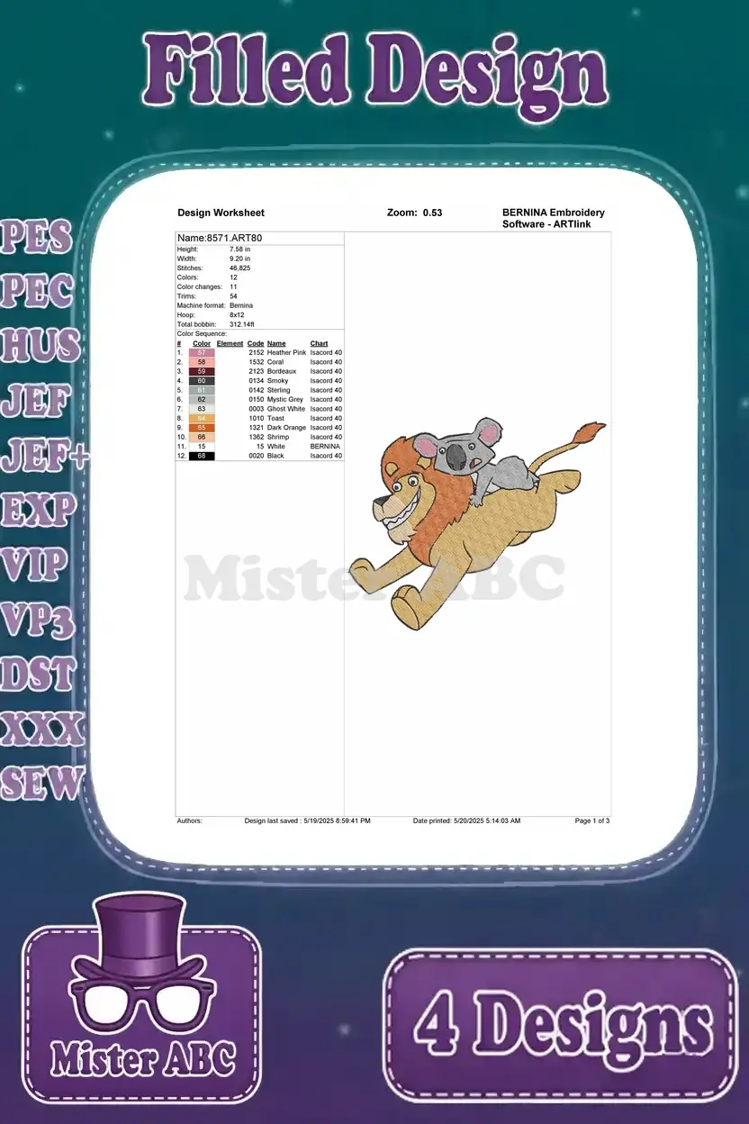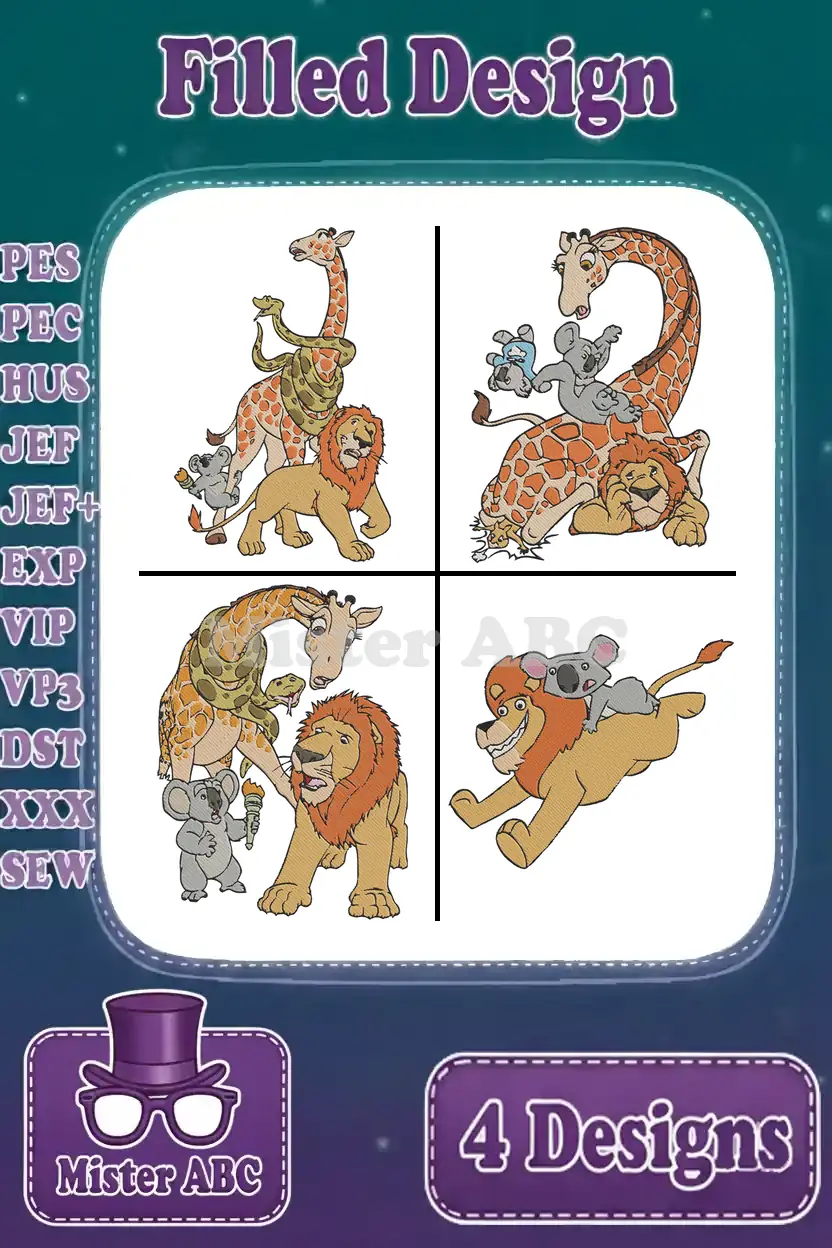 Coon Safari Animals – Lion Koala Giraffe Zebra Flying And Posing – Jungle Friends Adventure – Filled Embroidery Design