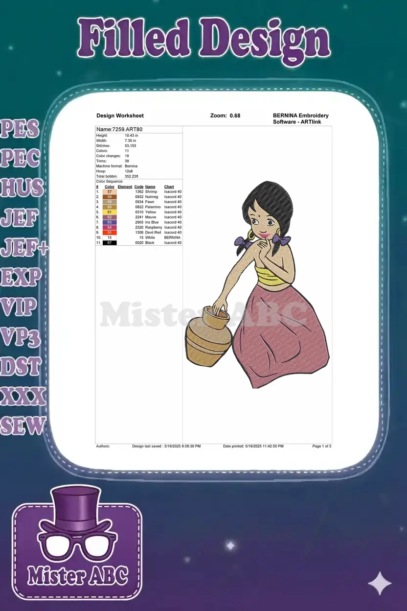 Coy Shanti girl with water pot embroidery designs
