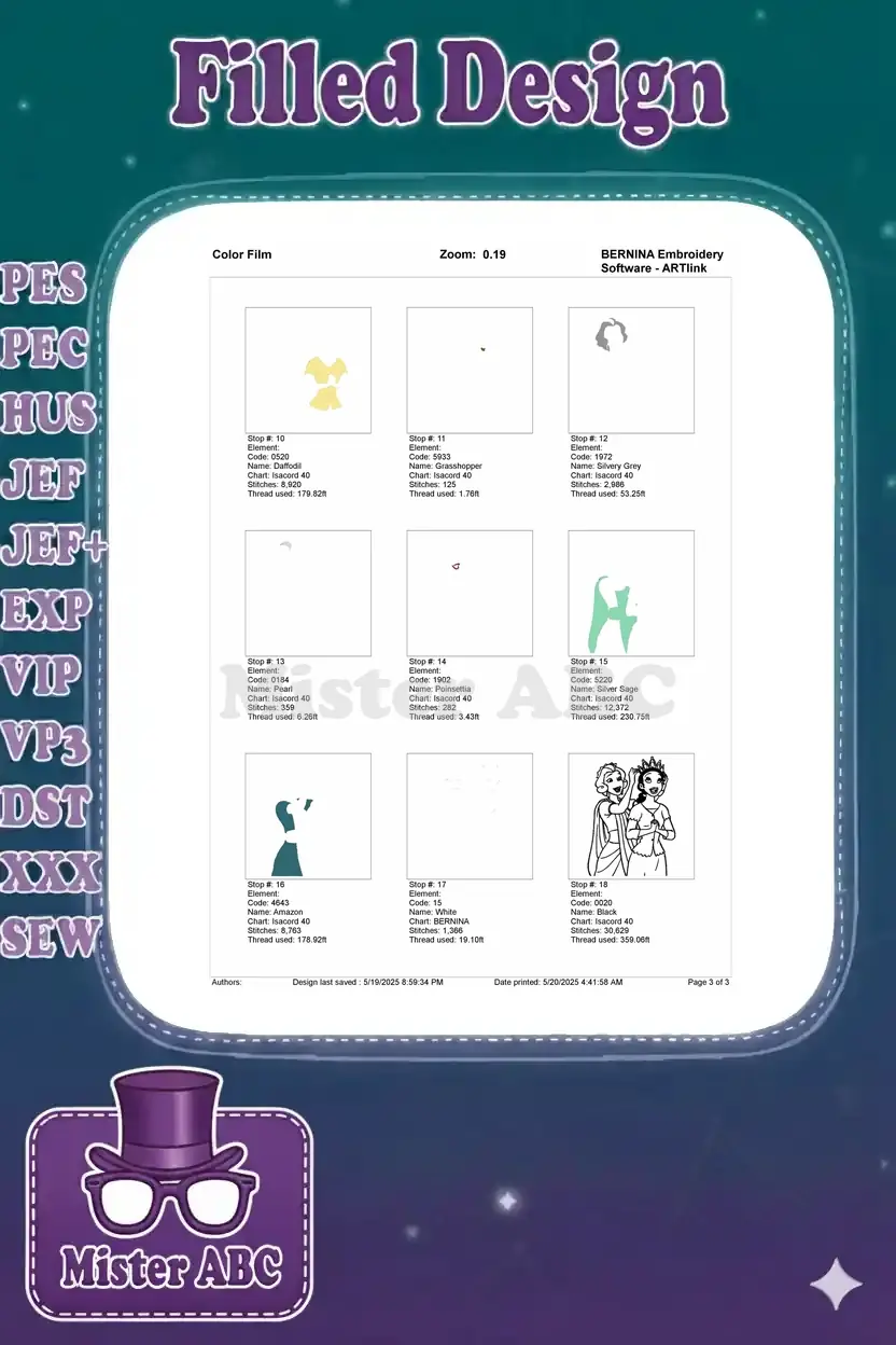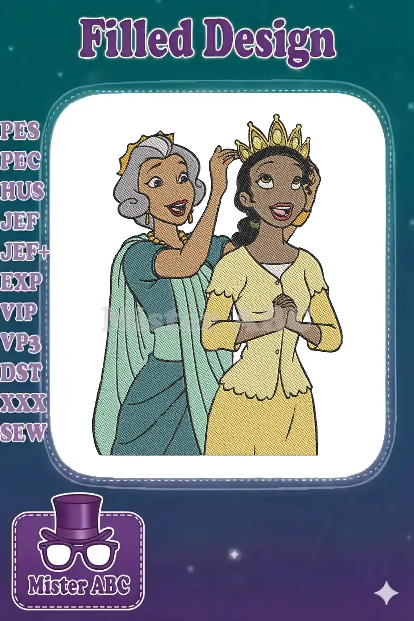 Capture a heartwarming moment with this embroidery design featuring Princess Tiana being crowned by Queen Eudora. Perfect for Disney fans.