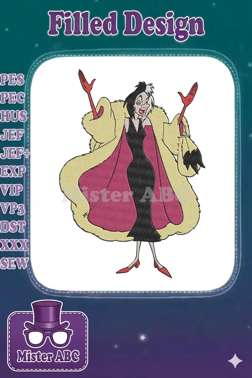 Cruella De Vil glamorous villain fur coat embroidery designs