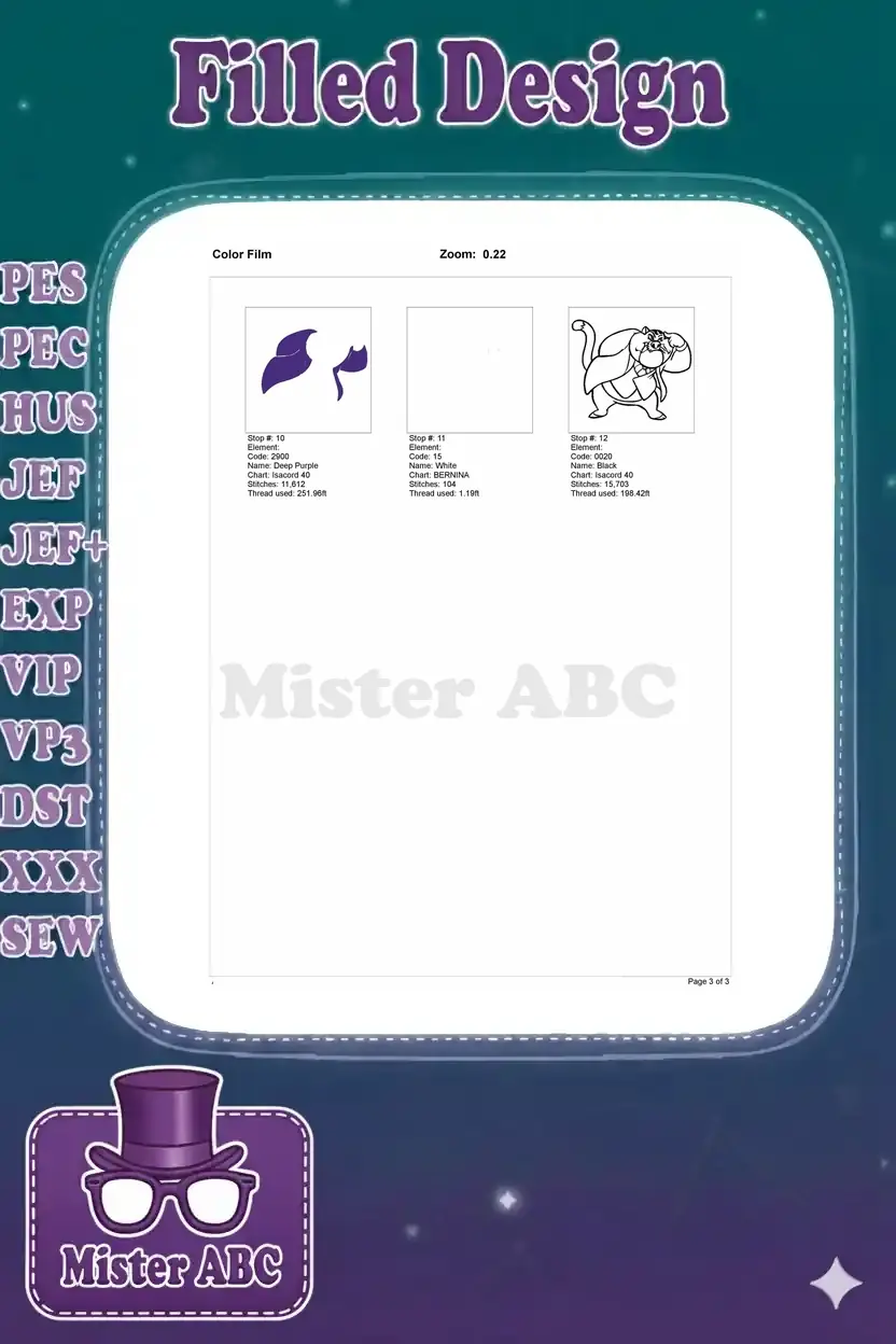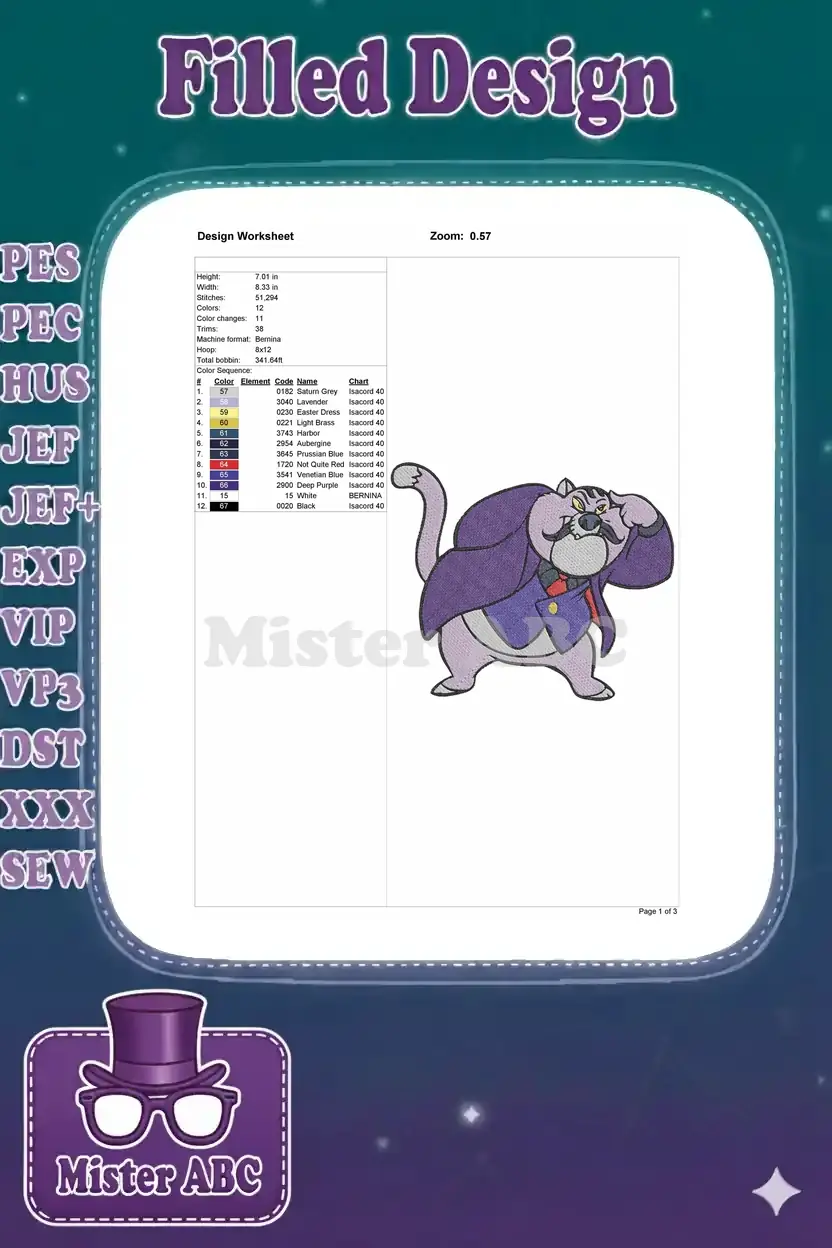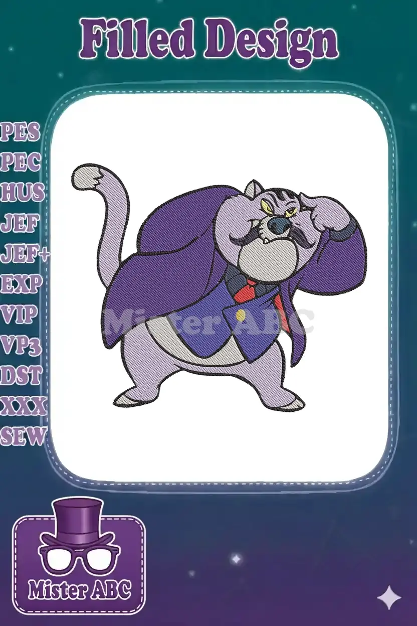Bring the classic villain Fat Cat to life with this detailed embroidery design. Perfect for fans of animated adventures!