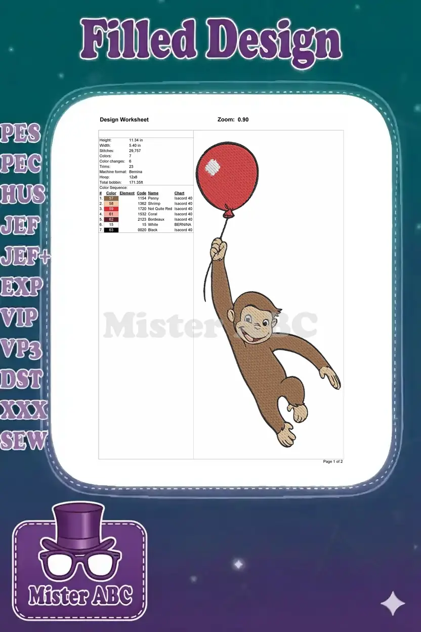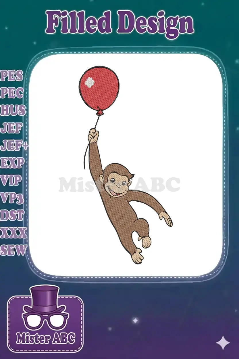 Curious George monkey flying with red balloon embroidery designs