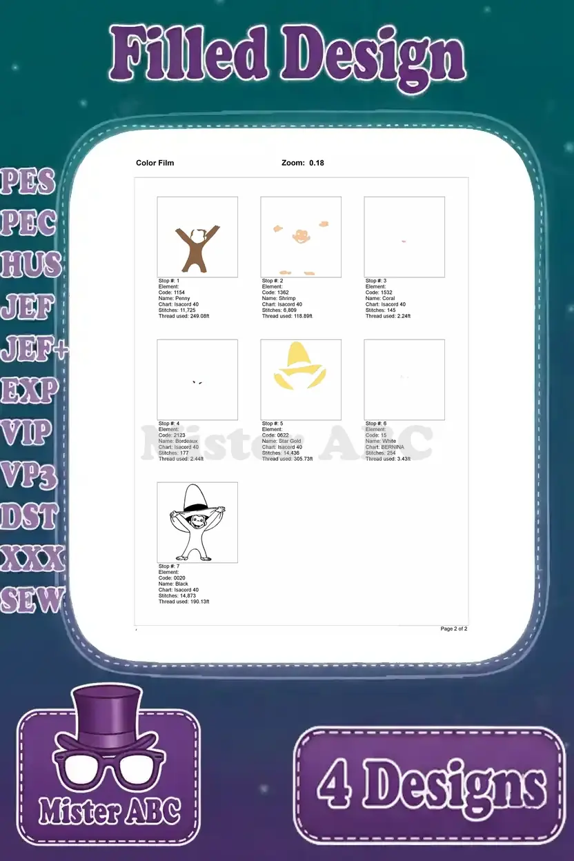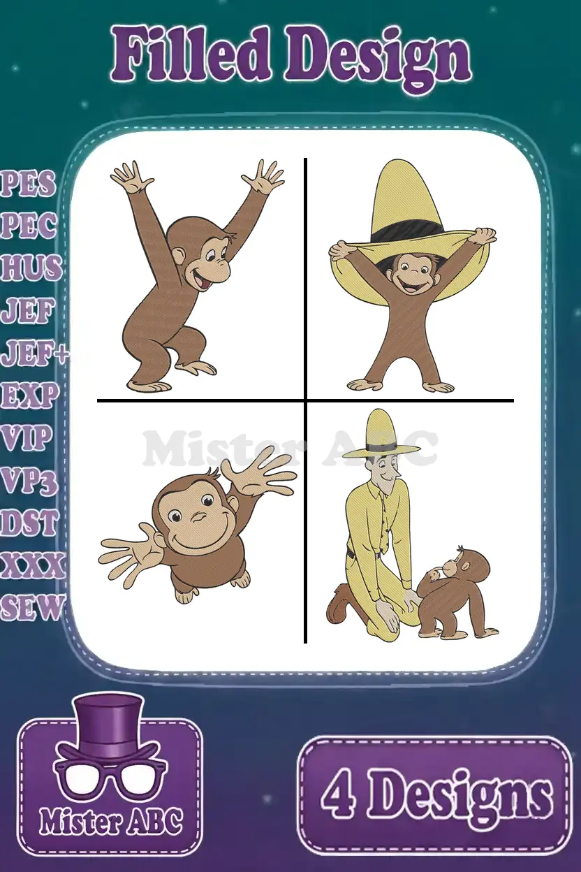 Curious George Monkey Waving Excited With Sombrero Man In Yellow Hat Friends Designs – Filled Embroidery Design