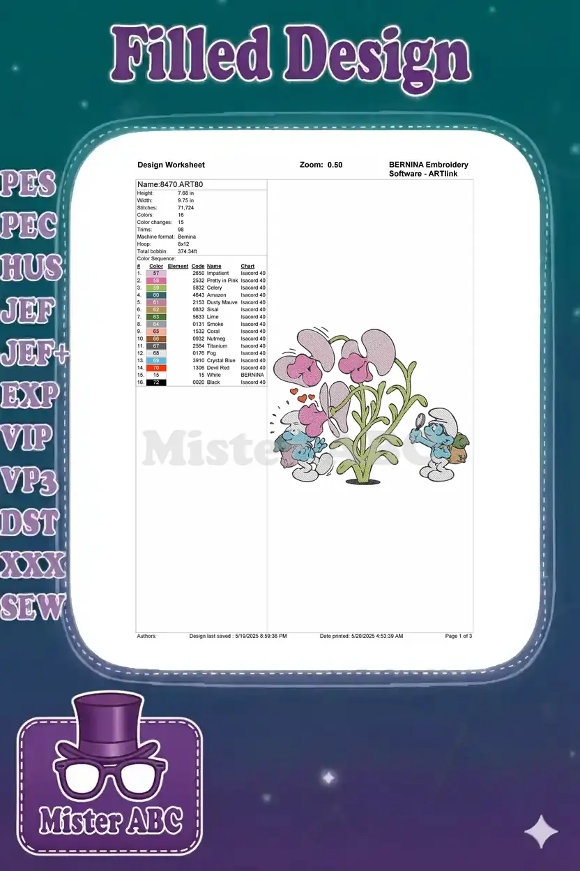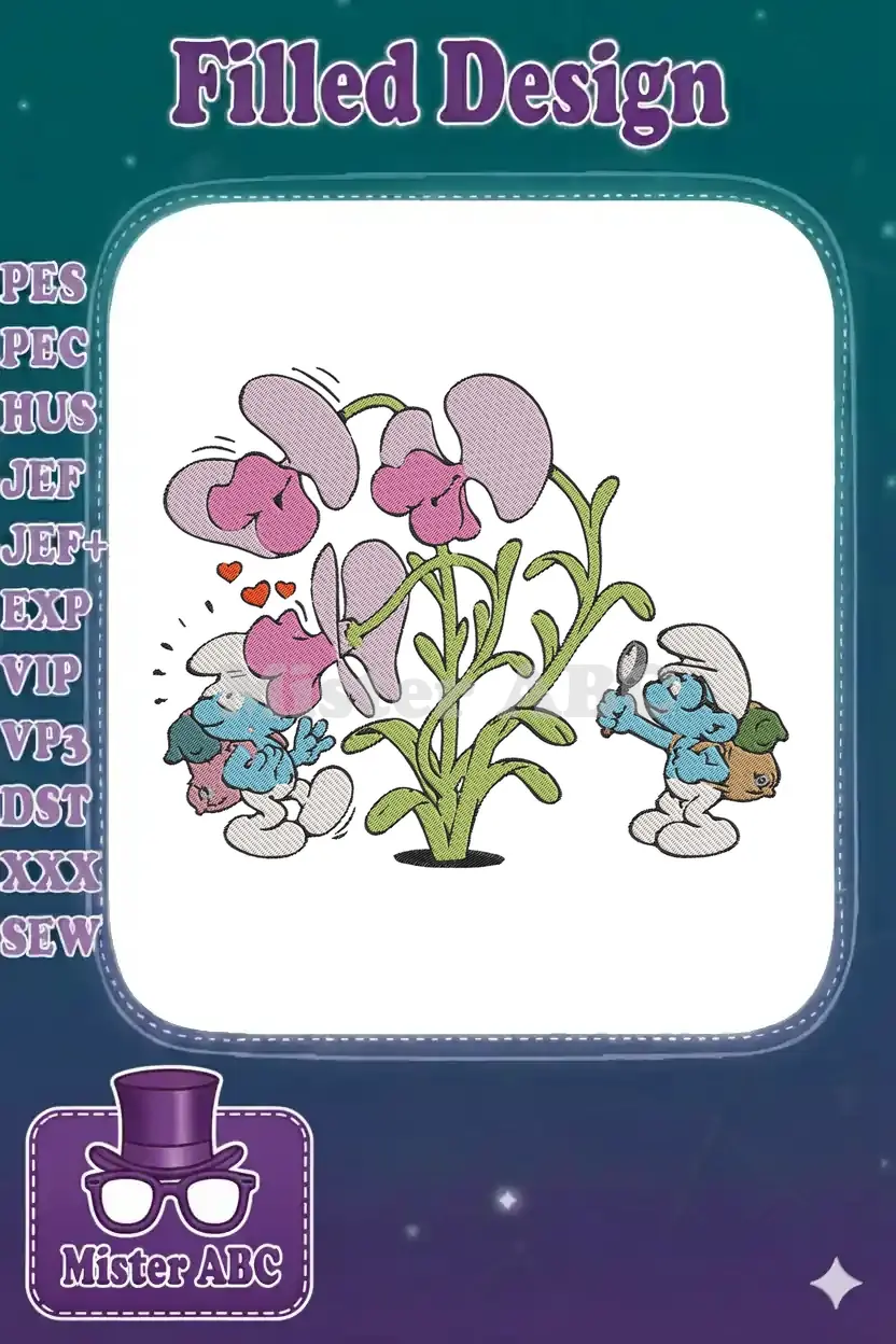 Curious Smurf with magnifying glass and surprised Smurf flower embroidery designs
