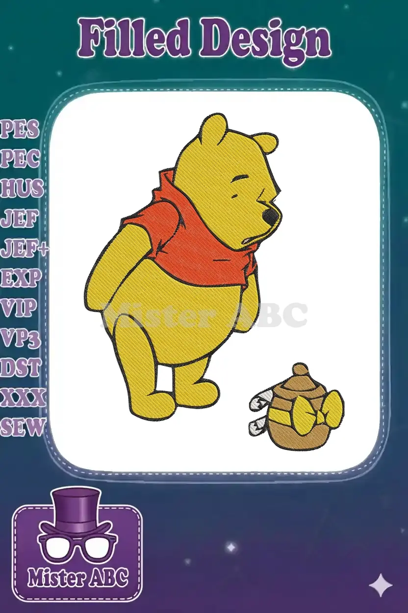 A charming Winnie the Pooh embroidery design capturing his timeless love for honey, perfect for delightful projects.