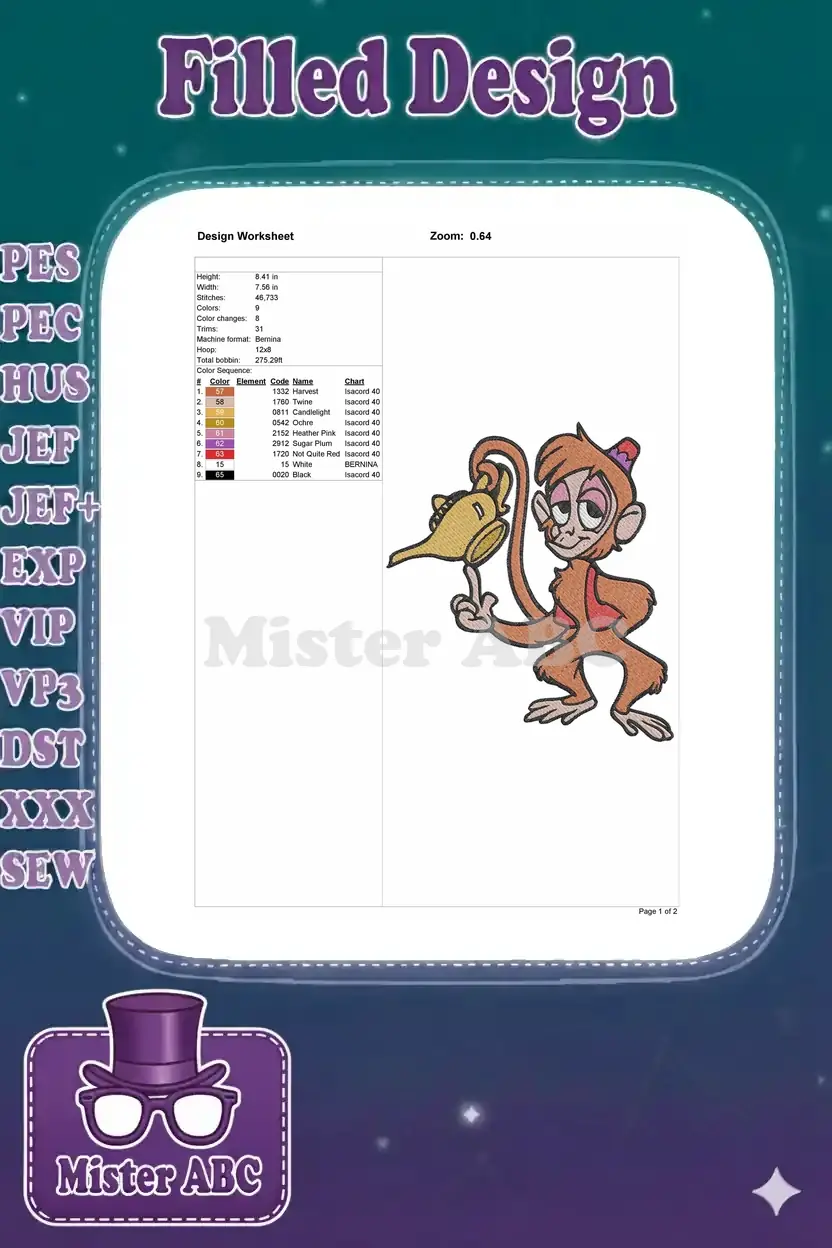 Cute Abu monkey with magic lamp Aladdin embroidery designs