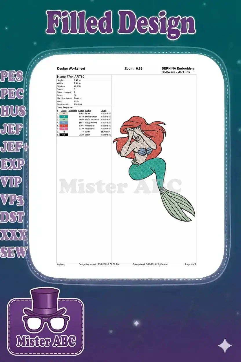Cute Ariel Little Mermaid Covering Eyes Red Hair Embroidery Designs