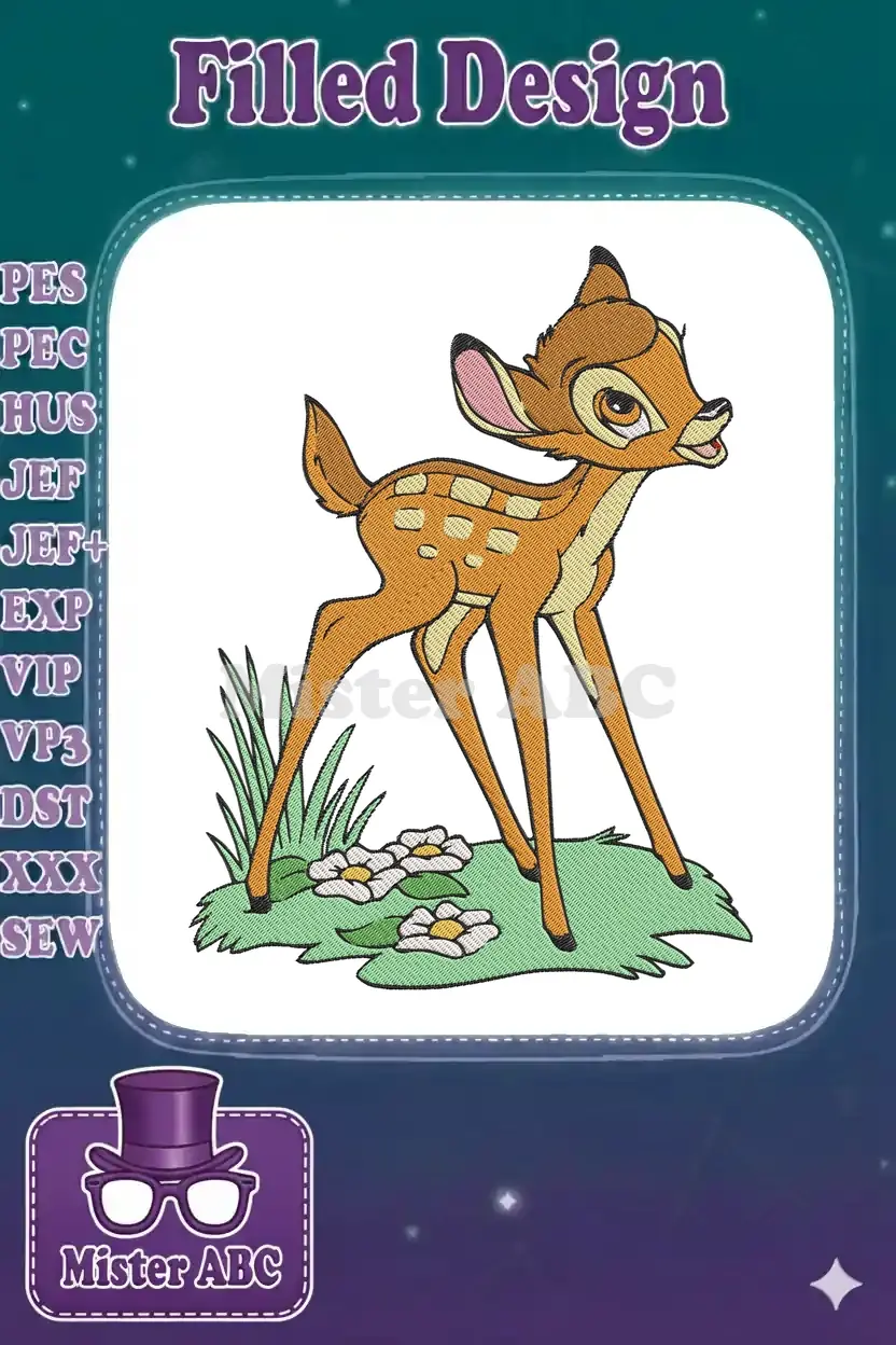 Capture the innocence of childhood with this adorable Bambi embroidery design, perfect for any Disney fan’s project.