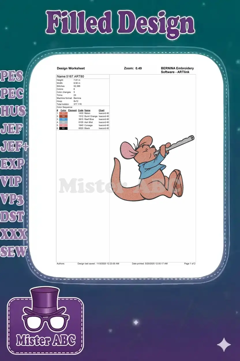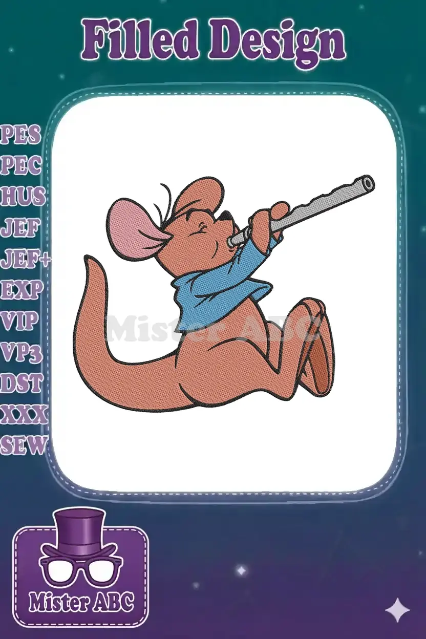 Cute baby kangaroo Roo playing flute music embroidery designs