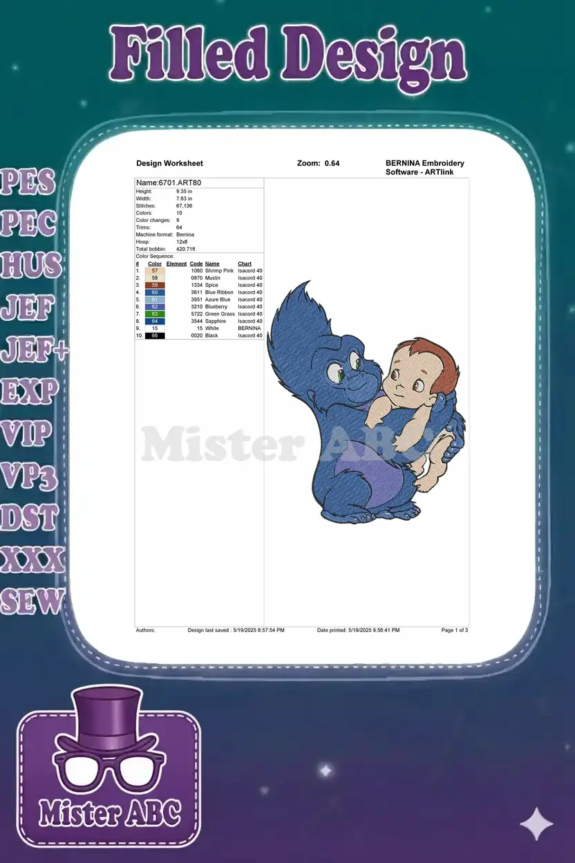 Cute blue gorilla holding baby cartoon embroidery designs