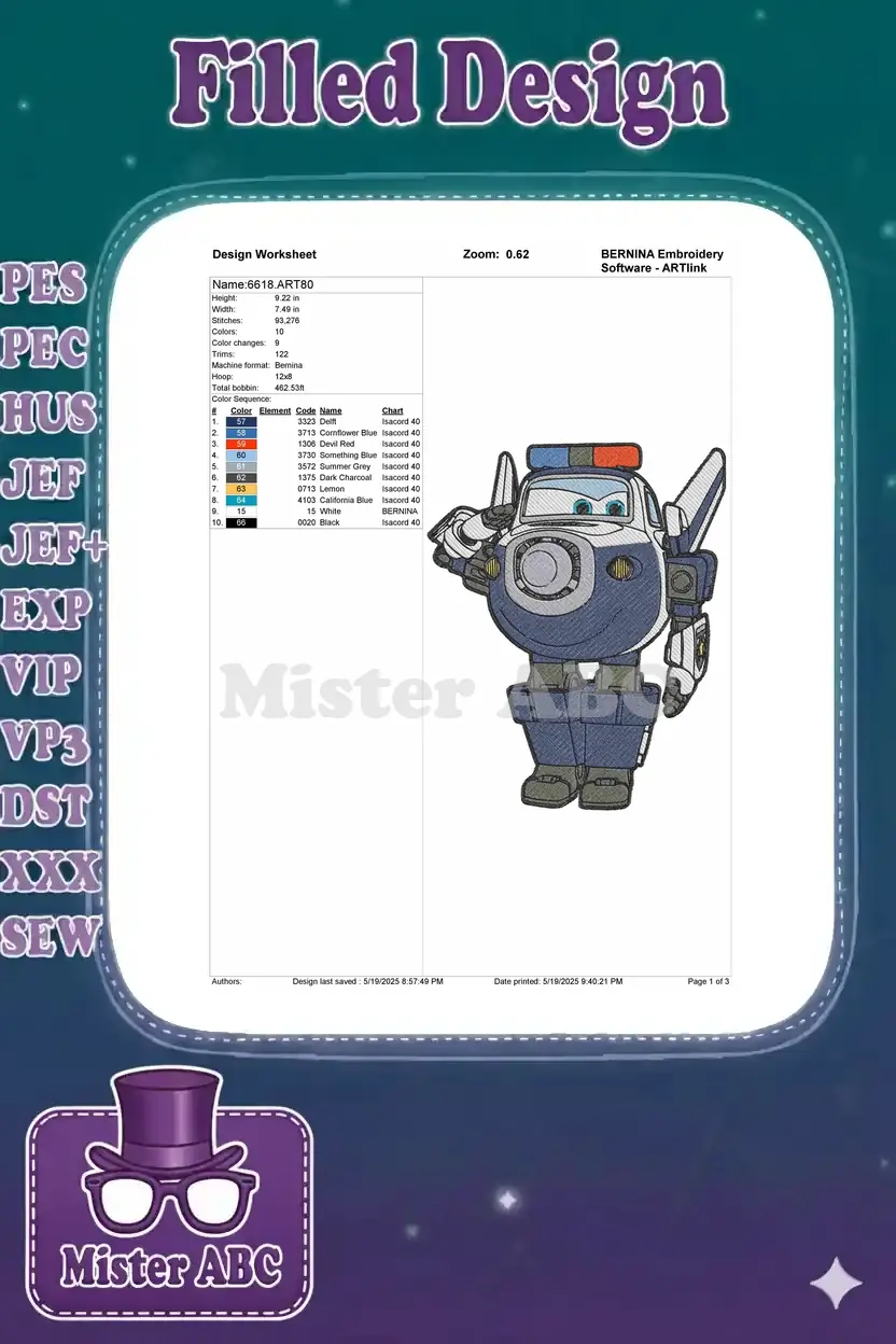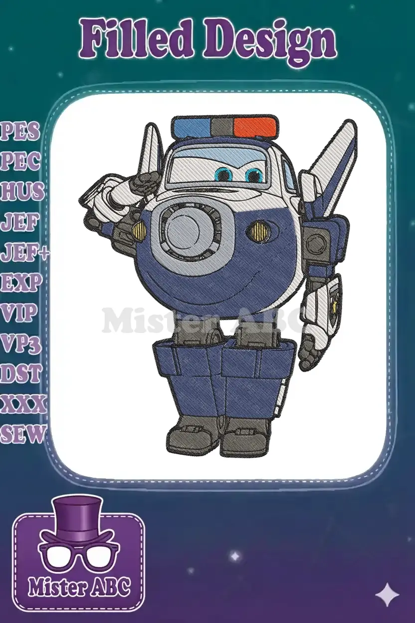 Bring heroic charm to any fabric with this vibrant Robocar Poli embroidery design, perfect for fans! This brave police car robot, Poli, saluting is ready to protect and serve on your projects. A delightful stitch for kids’ apparel and accessories.