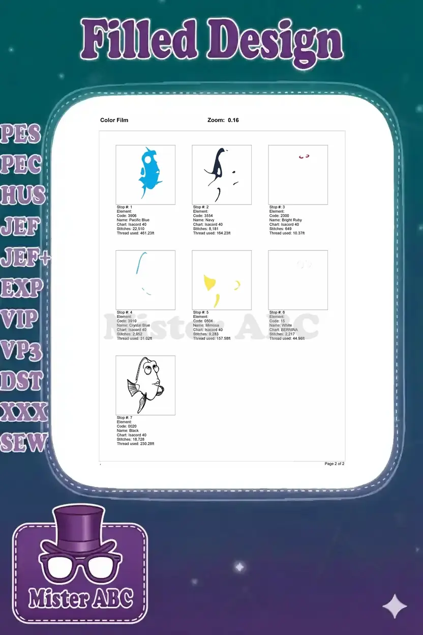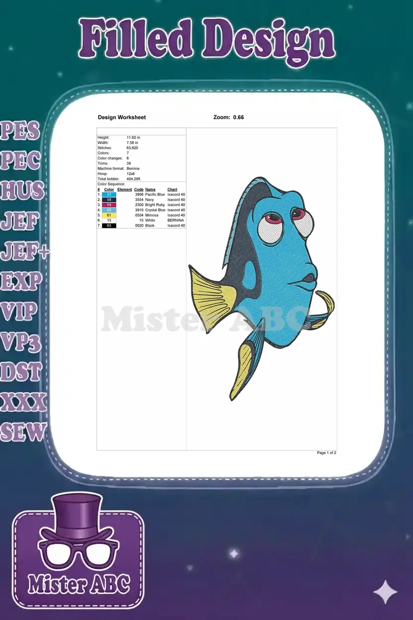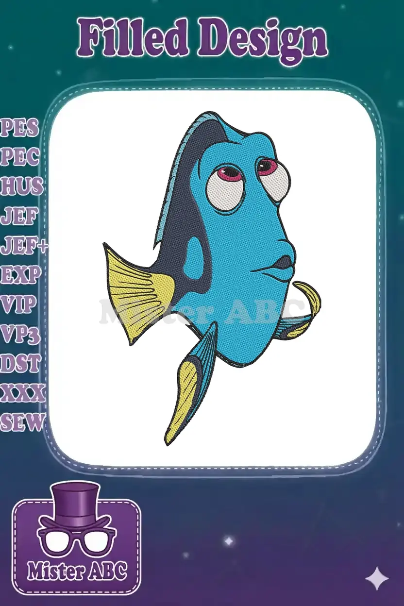 Cute blue tang Dory fish cartoon character embroidery designs