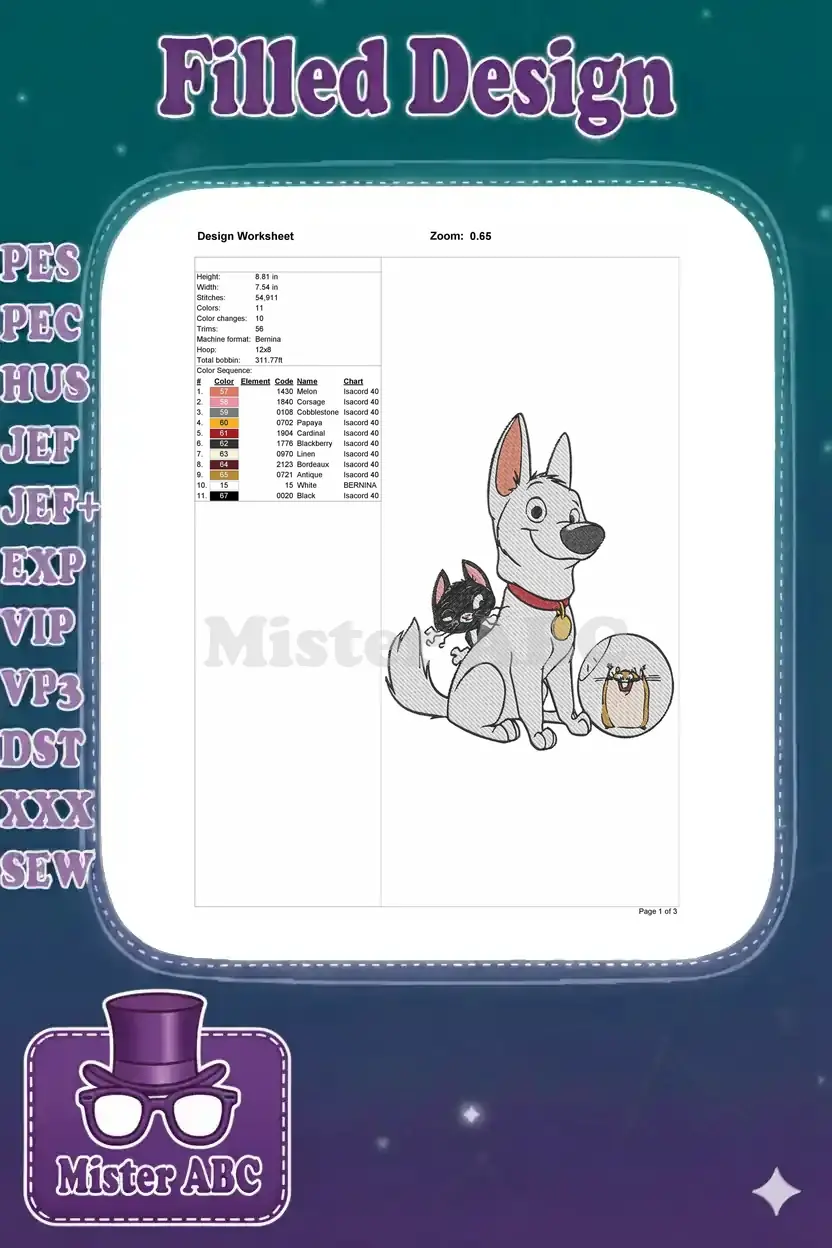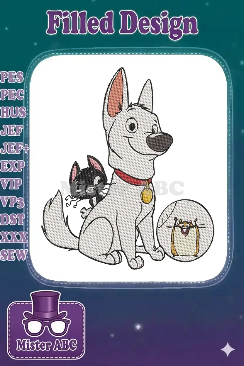 Capture the heartwarming friendship of Bolt, Mittens, and Rhino with this vibrant embroidery design, perfect for fans.