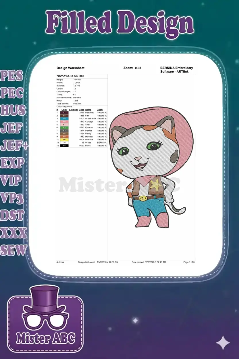 Cute Calico Cat Cowgirl Pink Hat Western Embroidery Designs